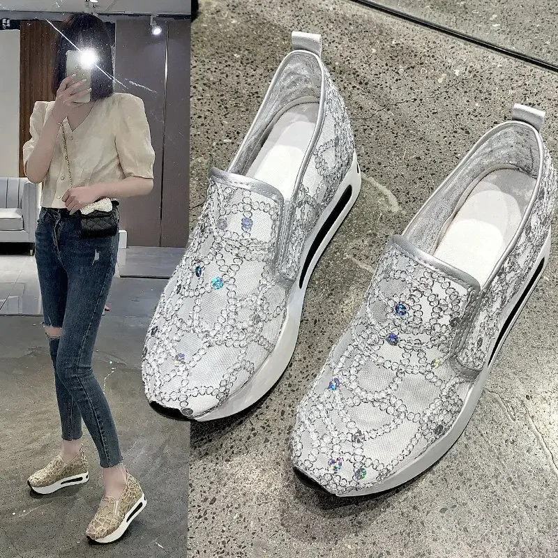Scarpe casual con zeppa Donna Estate 2025 Scarpe vulcanizzate in rete con paillettes dorate Suola in gomma Slip on Comode sneakers basse femminili