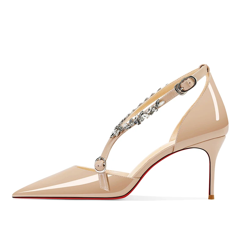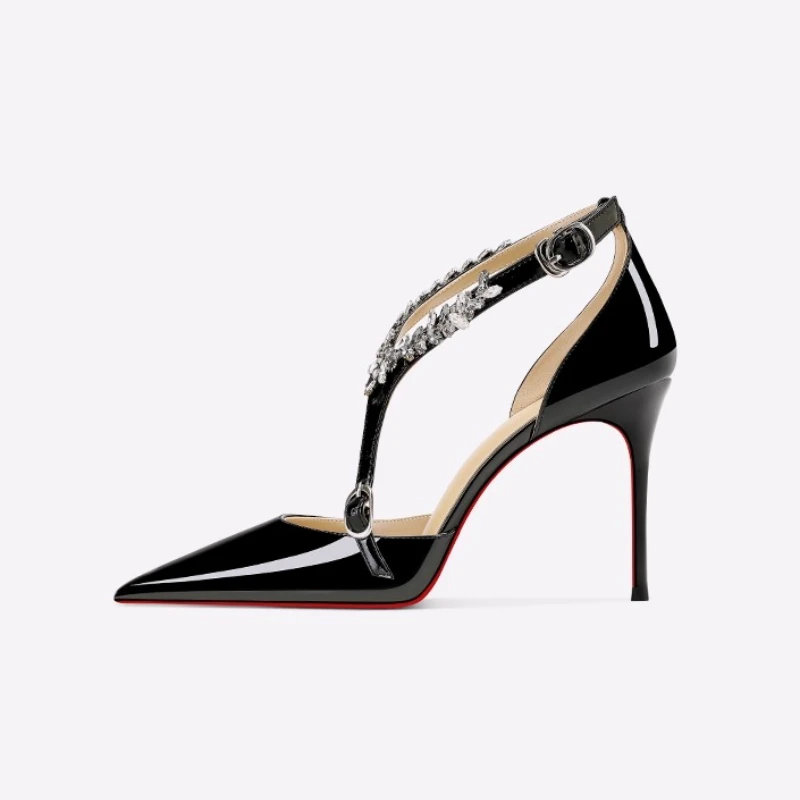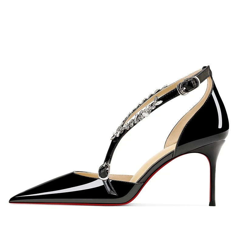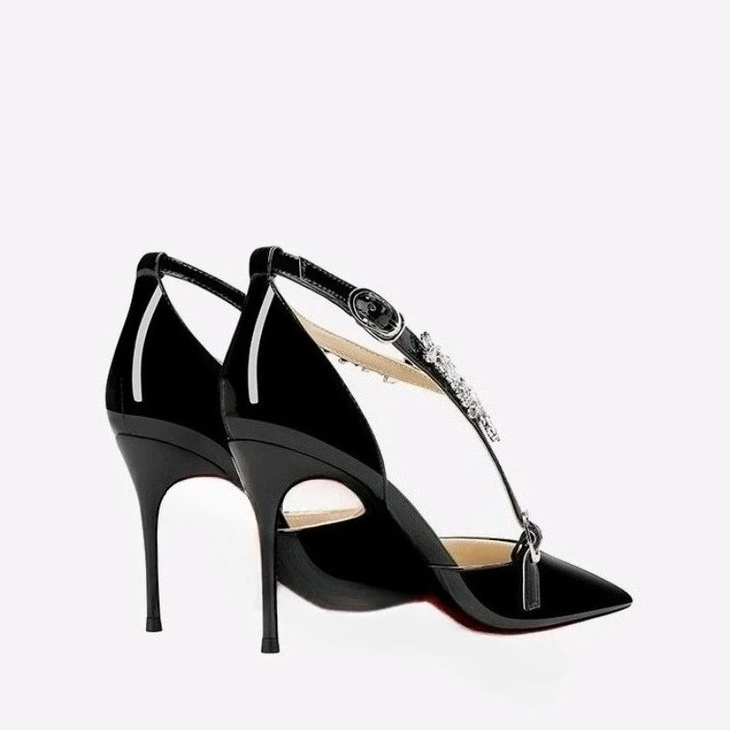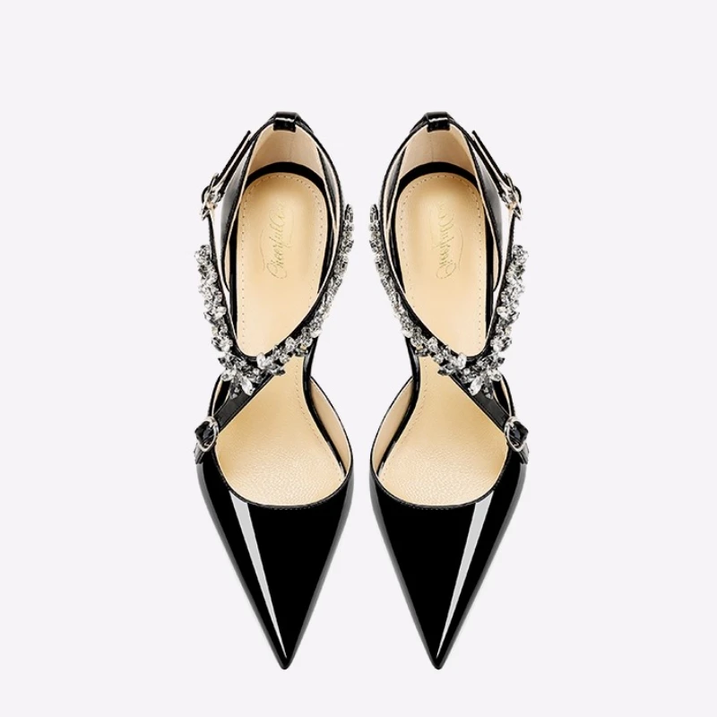 Scarpe col tacco alto con strass neri da donna 2025 nuovo stile estivo sandali sexy con cinturino con fibbia dritta e tacco sottile a punta