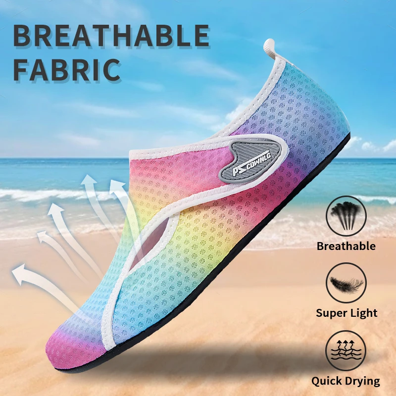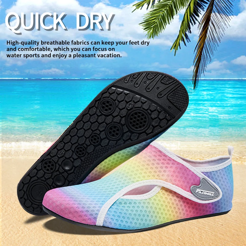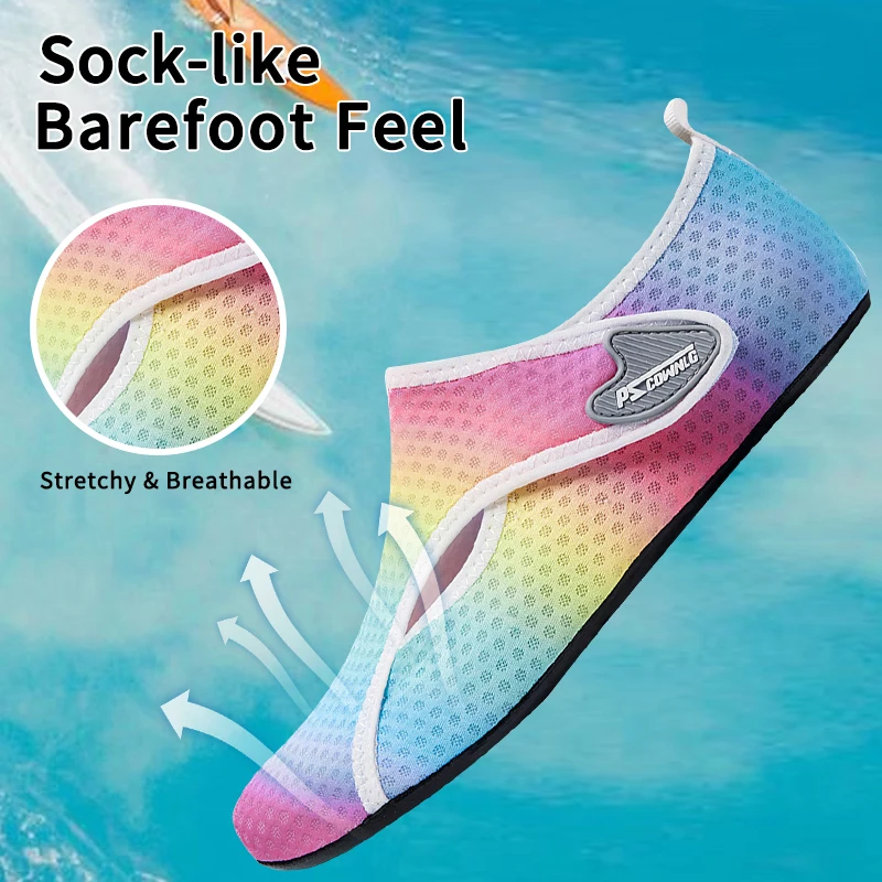 【COMFORTABLE】: I calzini da acqua utilizzano tessuti traspiranti e lisci con un fine elasticità sulla parte superiore e il design del collo liscio delle scarpe da bagno tenui cura delle caviglie.