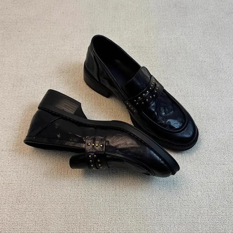 Scarpe Derby da donna morbide scarpe a punta appartamenti neri scarpe da ginnastica Casual da donna in stile britannico mocassini con rivetti Slip-on in pelliccia borchie Leath
