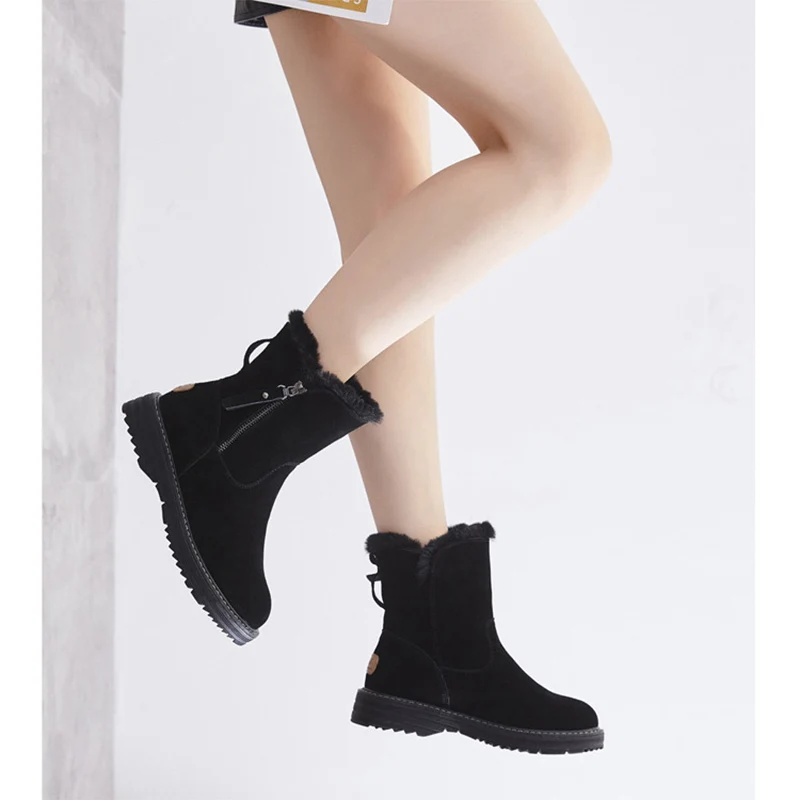 Scarpe invernali in vera pelle Stivali da neve da donna Suola spessa 3 cm Stivaletti da donna alla moda in peluche caldo Nero Taglie forti 41