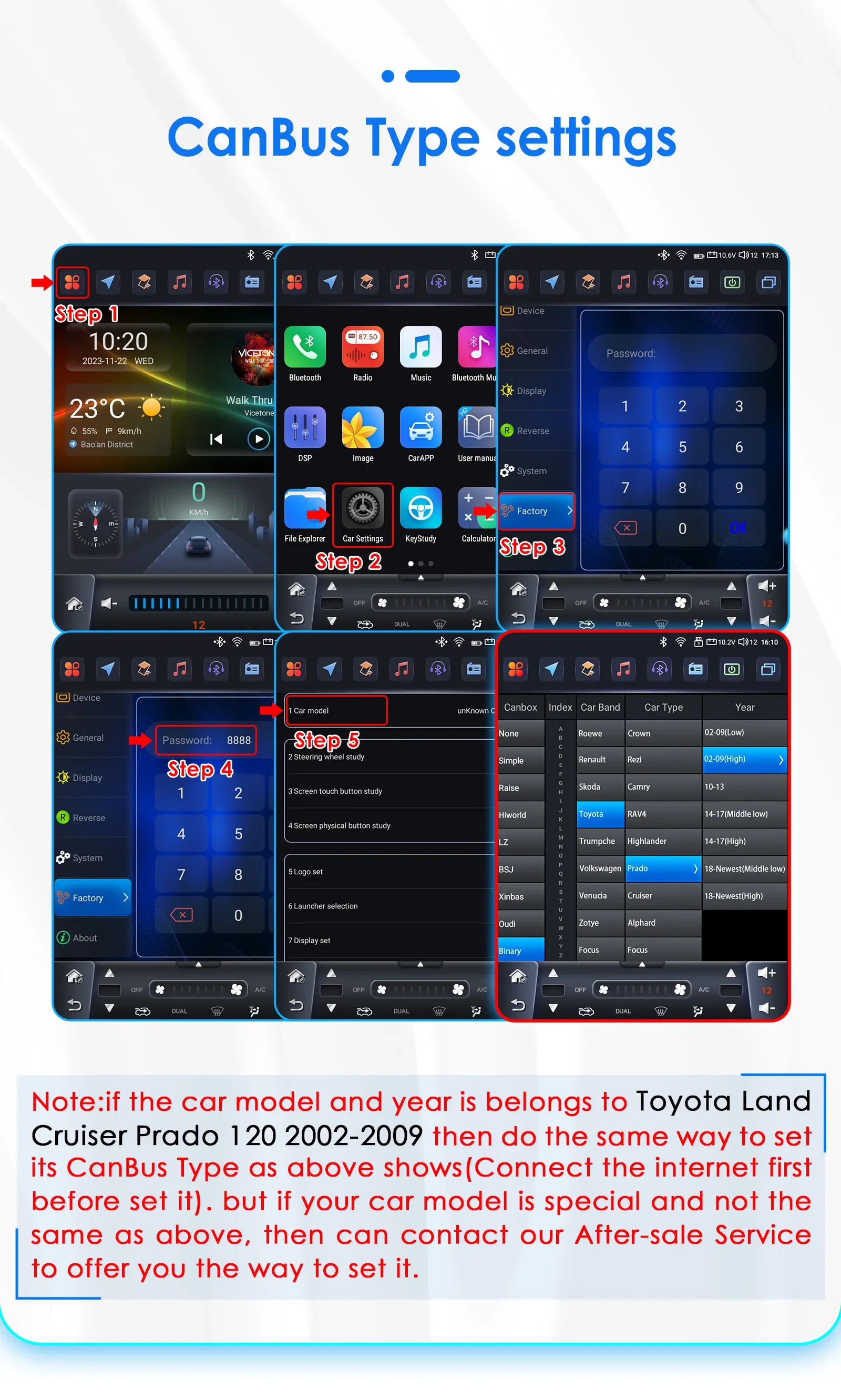 Impostazioni del tipo Canbus: Fabbrica–8888 (password serie S)–Modello auto–Binary–Toyota–Prado–02-09(Alto)–OK.il codice della serie P è 1617 delle impostazioni di fabbrica.