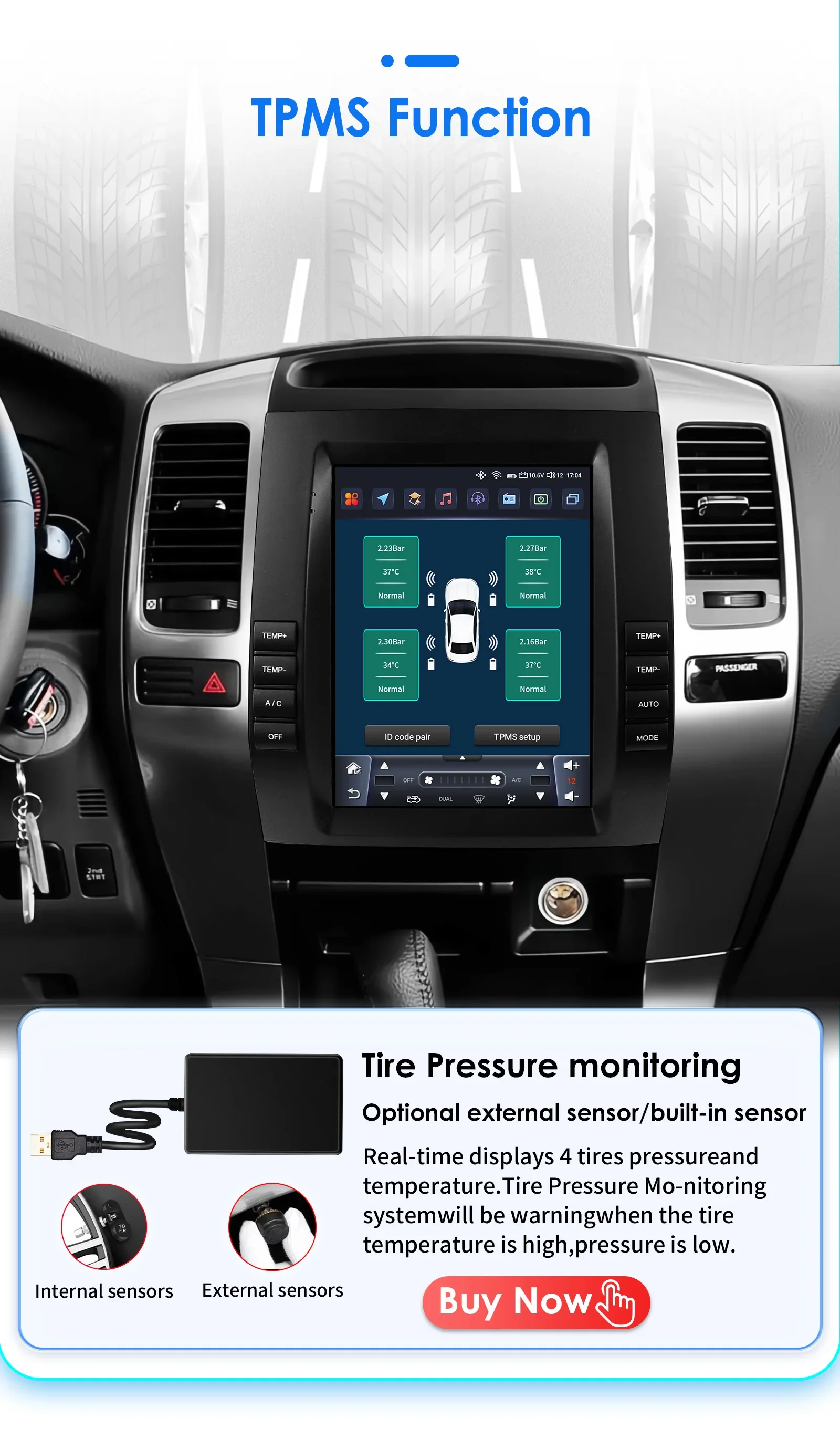 Funzione TPMS (da ordinare separatamente): Monitoraggio della pressione dei pneumatici: visualizza in tempo reale la pressione e la temperatura di 4 pneumatici, il sistema di monitoraggio della pressione dei pneumatici avviserà quando la temperatura dei pneumatici è alta o la pressione è bassa.