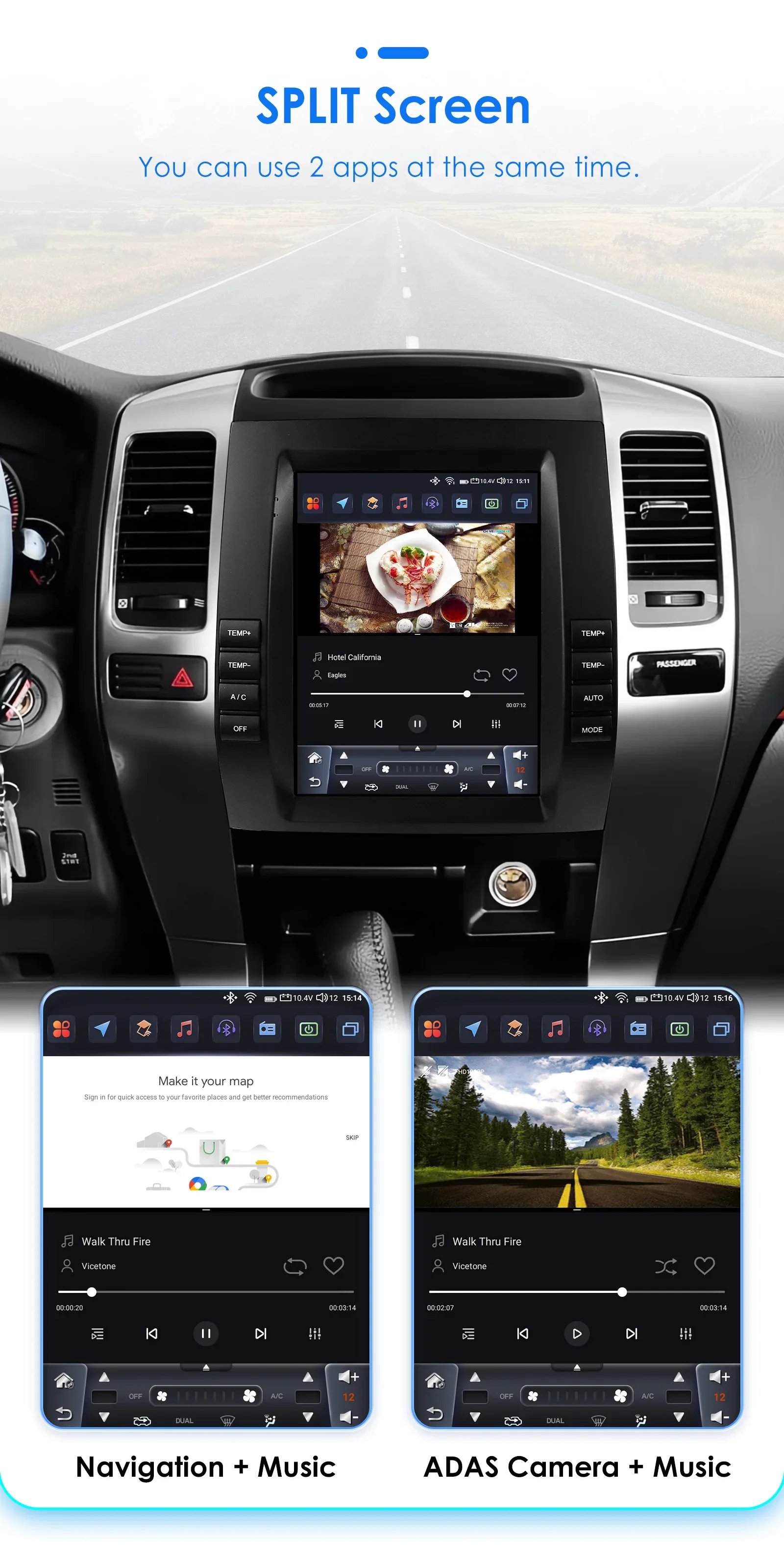 Schermo diviso: puoi utilizzare 2 app contemporaneamente (come: navigazione + musica, fotocamera ADAS + musica, ecc.)