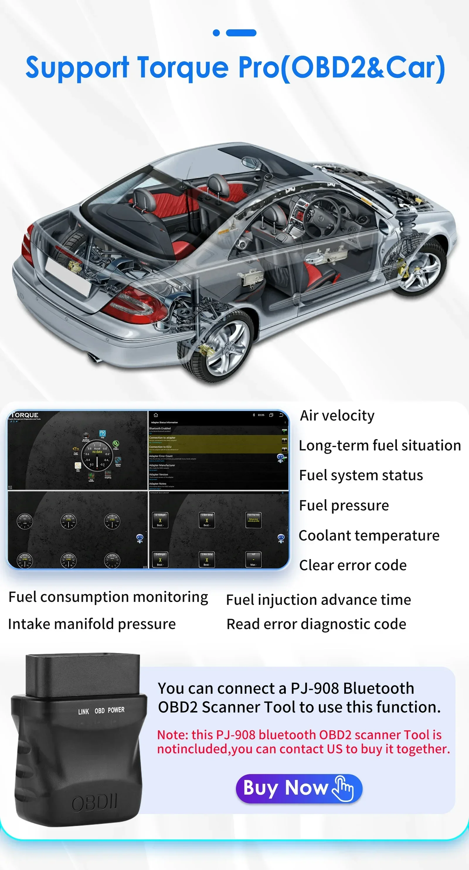 Supporto Torque Pro (OBD2 e auto): è possibile collegare uno strumento scanner Bluetooth OBD2 PJ-908 per utilizzare questa funzione.Nota: questo strumento scanner Bluetooth OBD2 PJ-908 non è incluso, puoi contattarci per acquistarlo insieme.