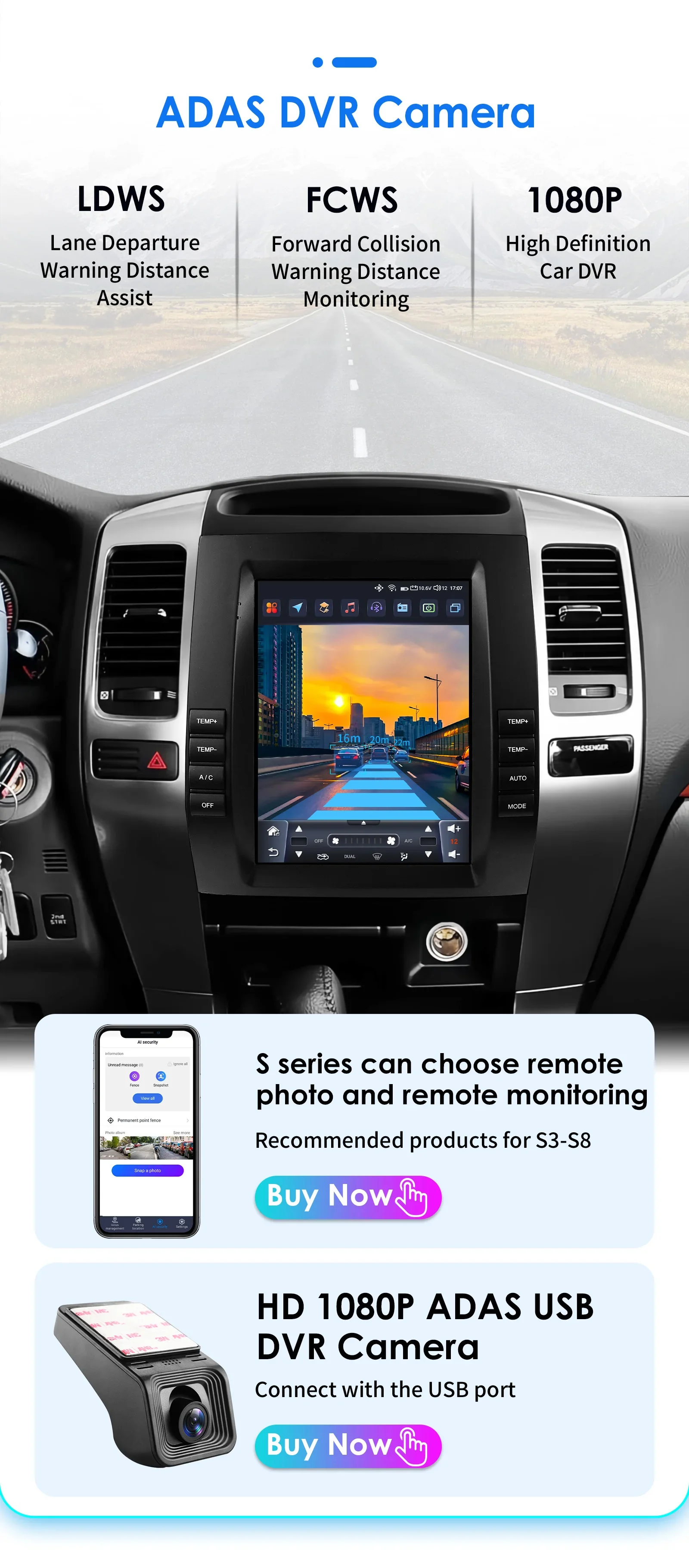 Telecamera DVR ADAS HD 1080P (da ordinare separatamente) –collegarsi alla porta USB: LDWS (distanza di avviso di uscita della corsia), FCWS (distanza di avviso di collisione in avanti), 1080P (DVR per auto ad alta definizione).