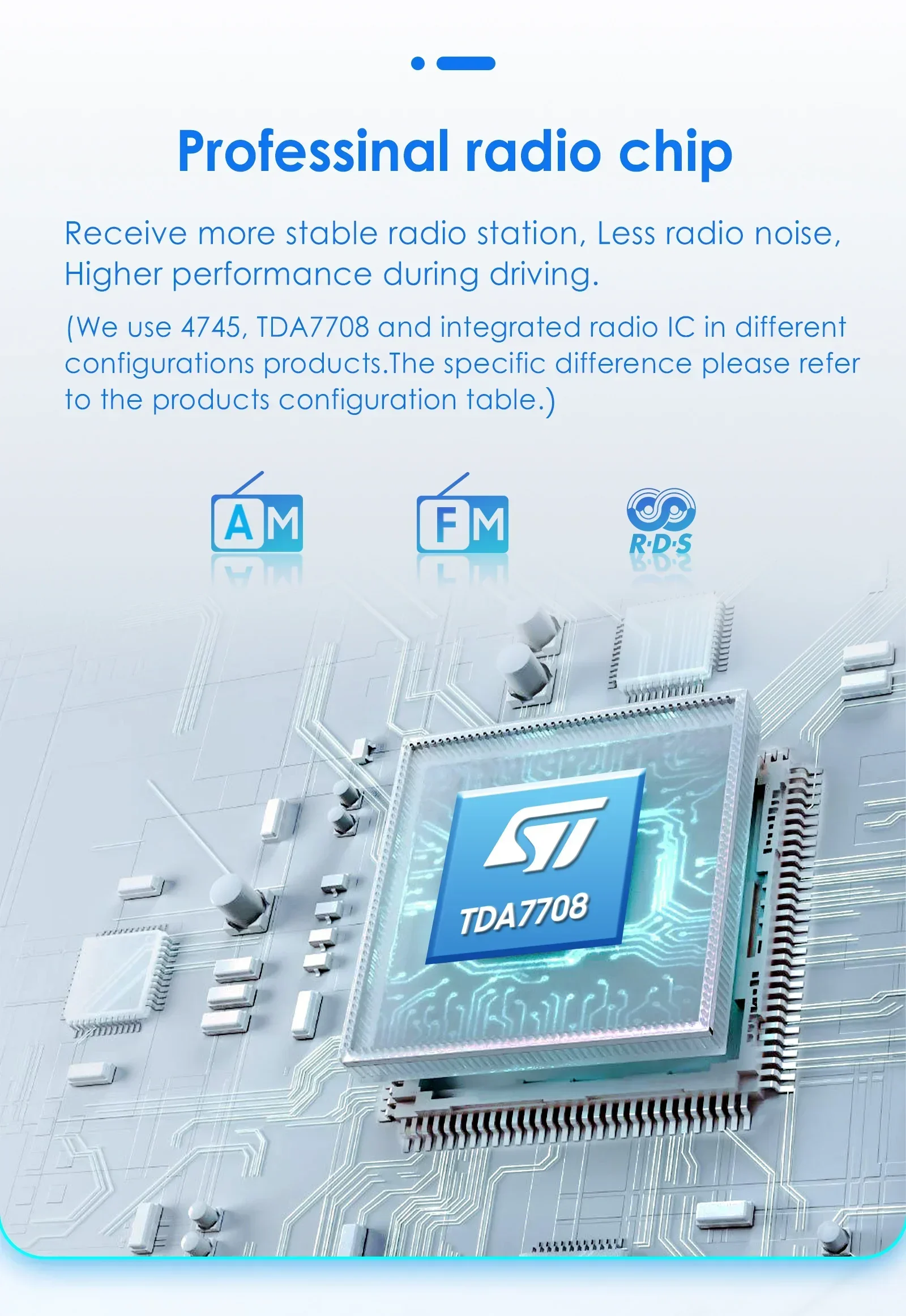Chip radio professionale: ricevi una stazione radio più stabile, meno rumore radio, prestazioni più elevate durante la guida.(Utilizziamo 4745, TDA7708 e IC radio integrato in diverse configurazioni di prodotti, per le differenze specifiche fare riferimento alla tabella di configurazione dei prodotti.)