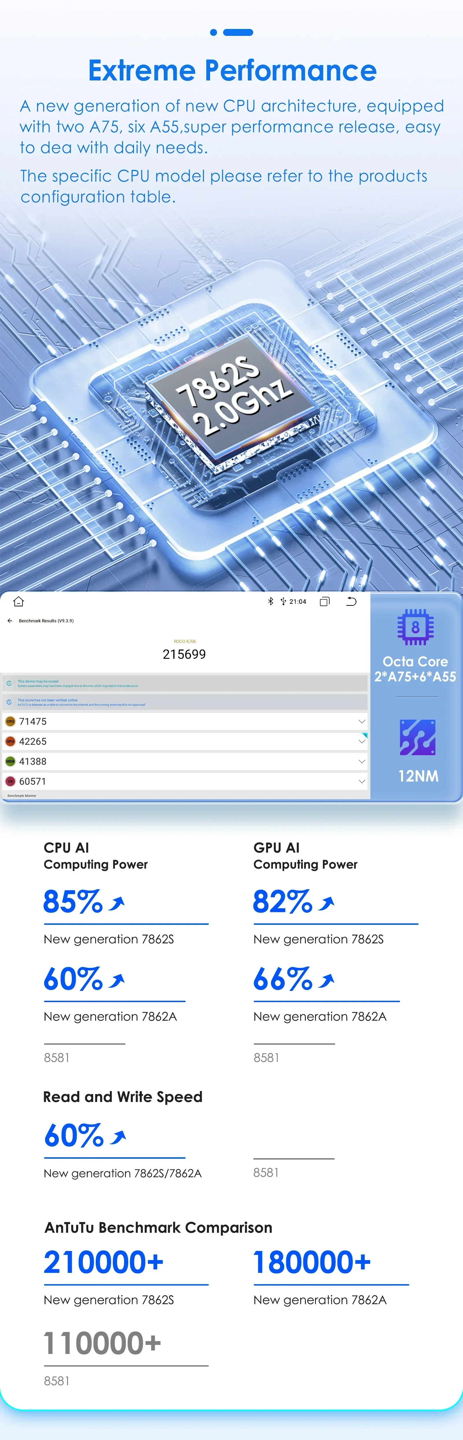 Prestazioni estreme: una nuova generazione di nuova architettura CPU, dotata di due A75, sei A55, versione super performante, facile da gestire con le esigenze quotidiane.Per il modello specifico della CPU fare riferimento alla tabella di configurazione dei prodotti.7862A 1,8 Ghz.