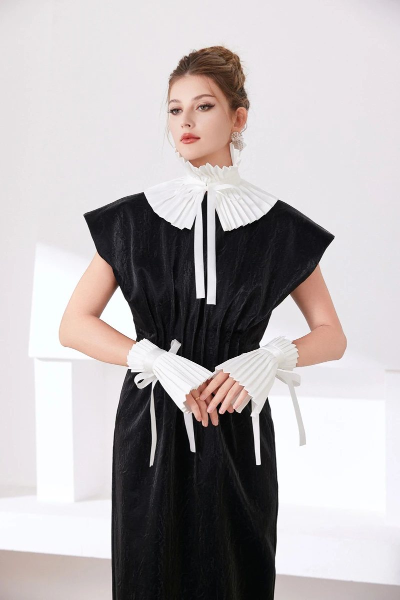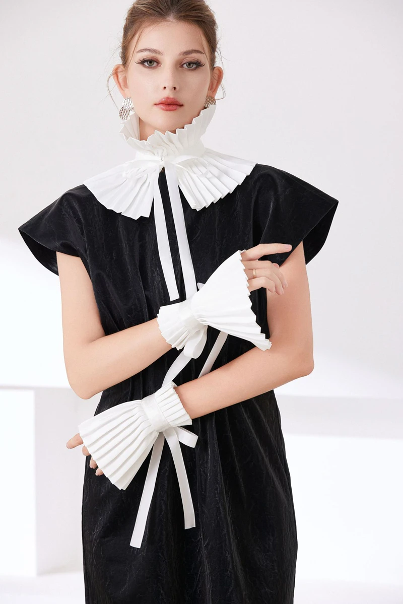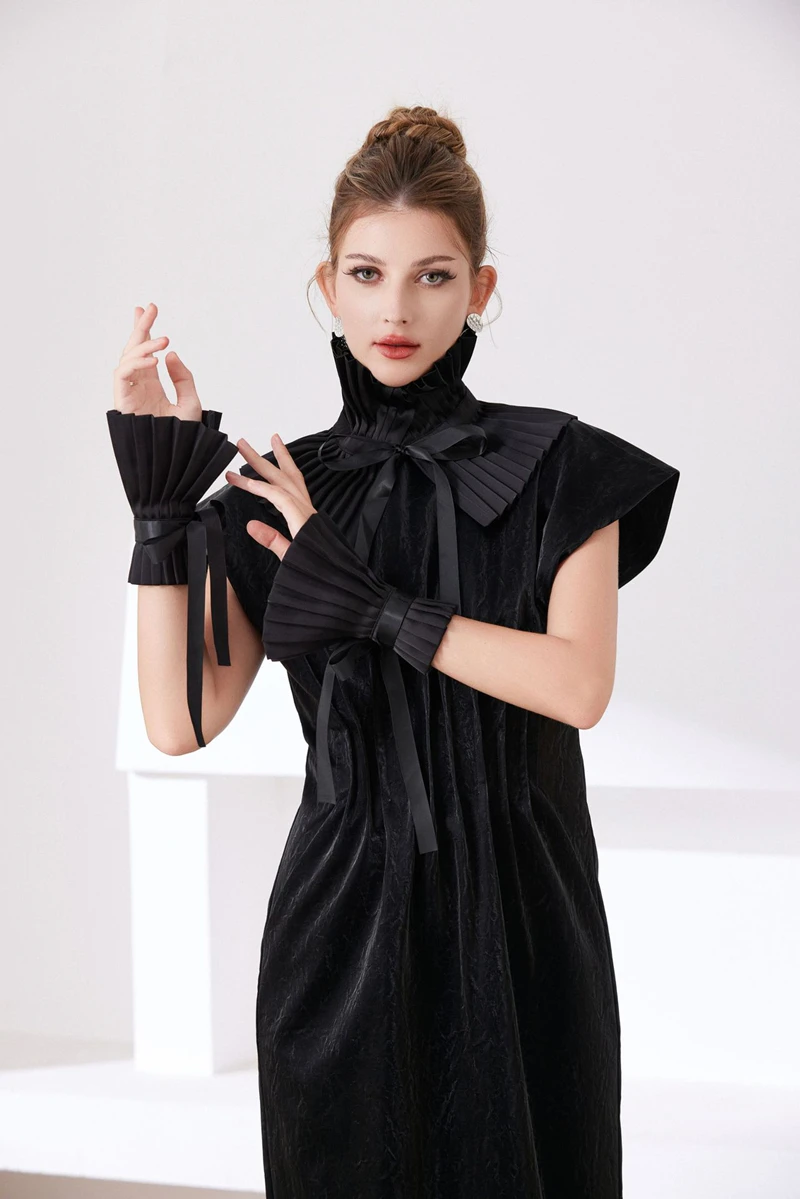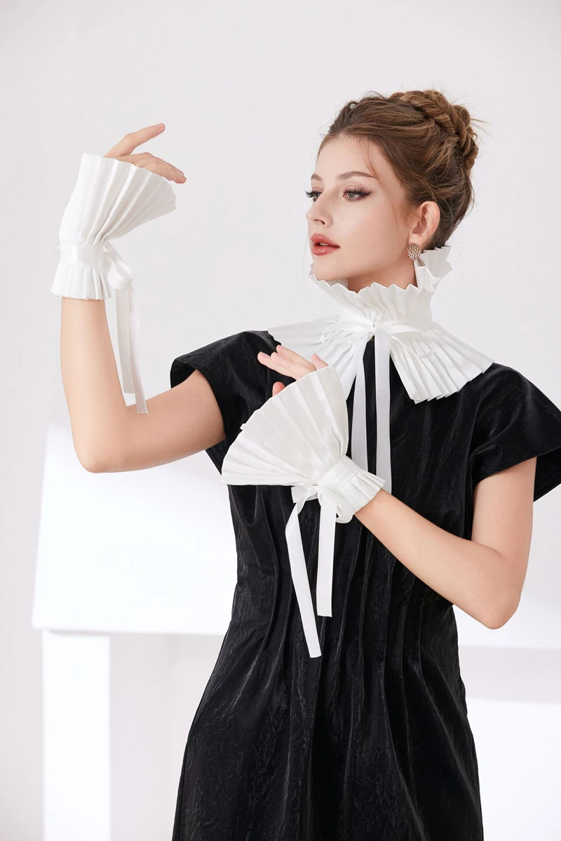 Scialle nero Colletto falso Tinta unita Copri collo con volant Cravatta Polsini con colletto pieghettato Set per accessori per costumi da festa