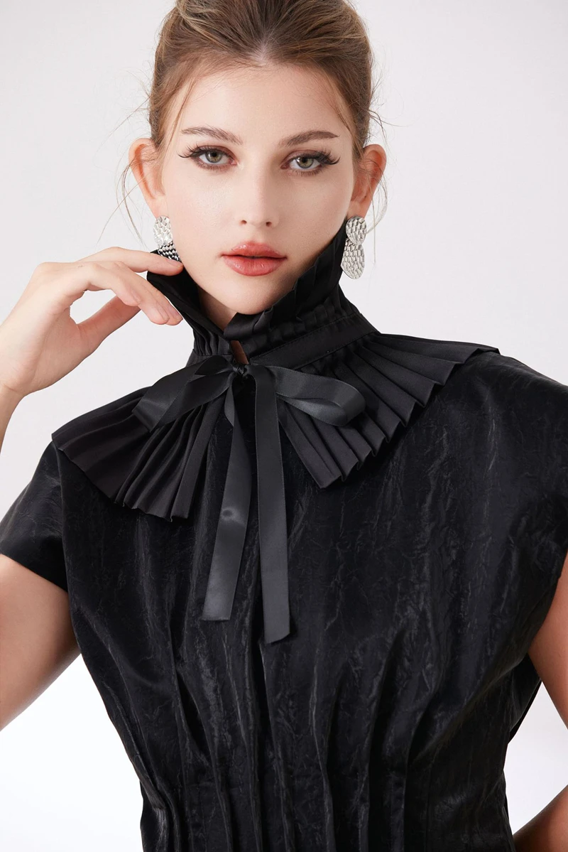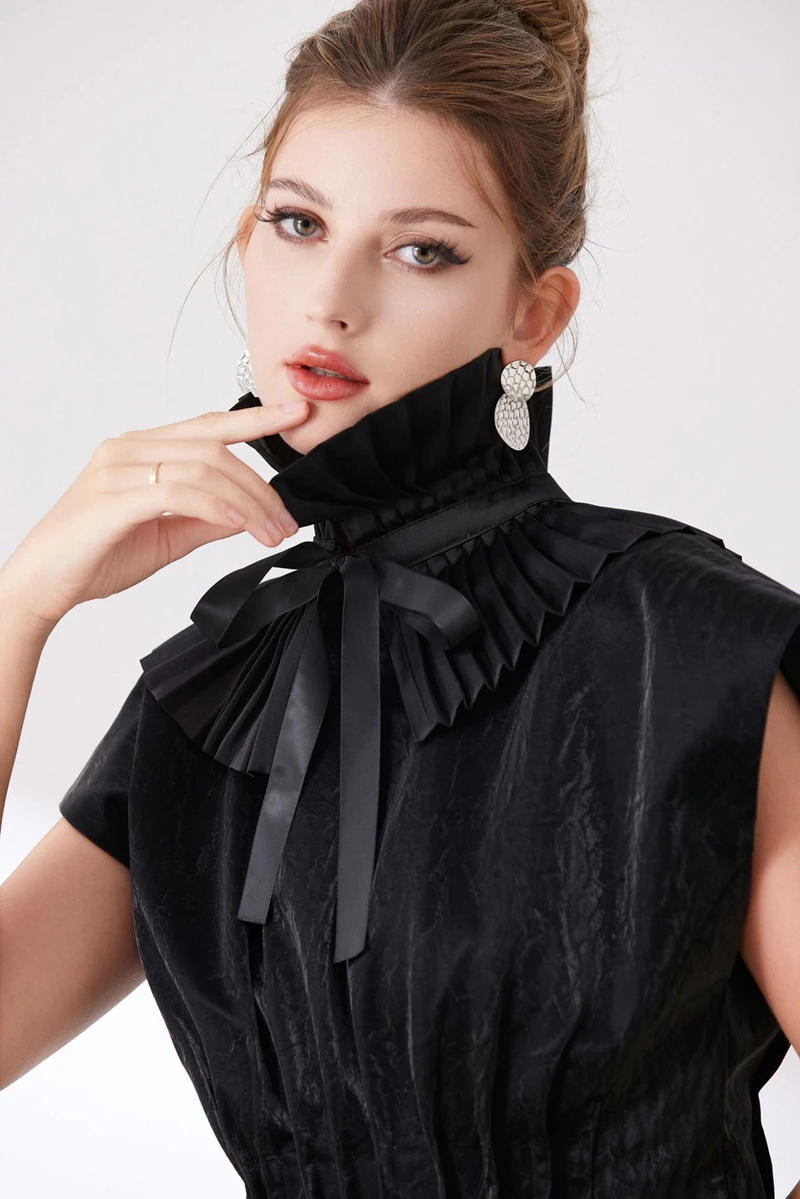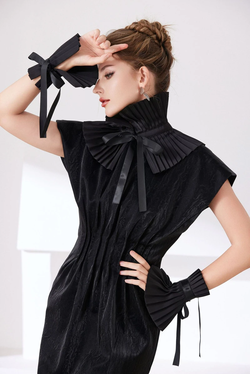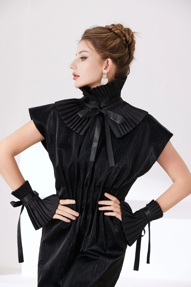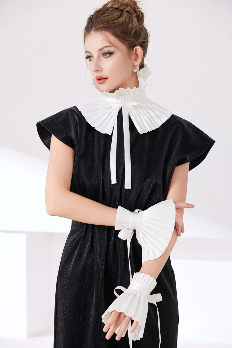 Scialle nero Colletto falso Tinta unita Copri collo con volant Cravatta Polsini con colletto pieghettato Set per accessori per costumi da festa 1Scialle nero Colletto falso Tinta unita Copri collo con volant Cravatta Polsini con colletto pieghettato Set per accessori per costumi da festa