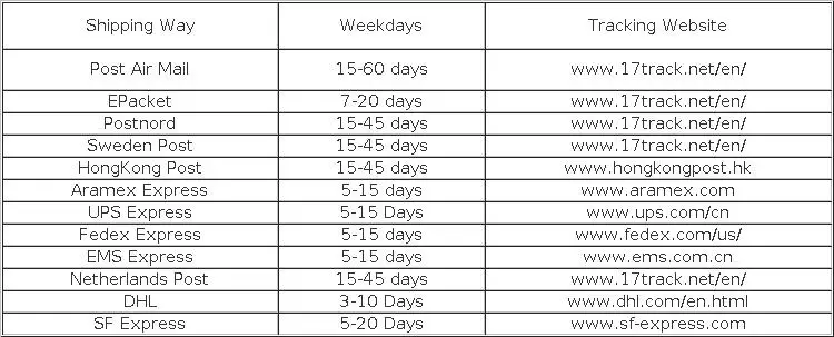 1. La data di consegna superiore è solo per riferimento, a volte sarà ritardata da vacanze, festival, intemperie, dogana, ecc.