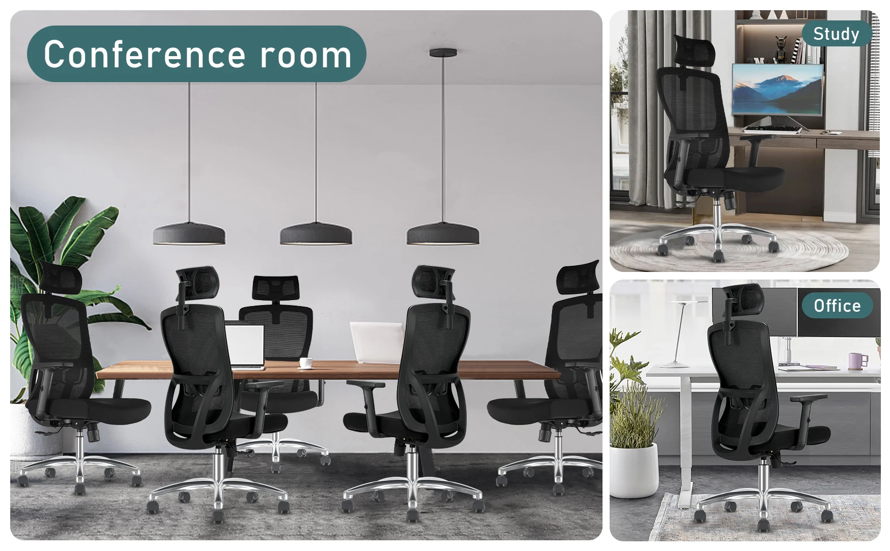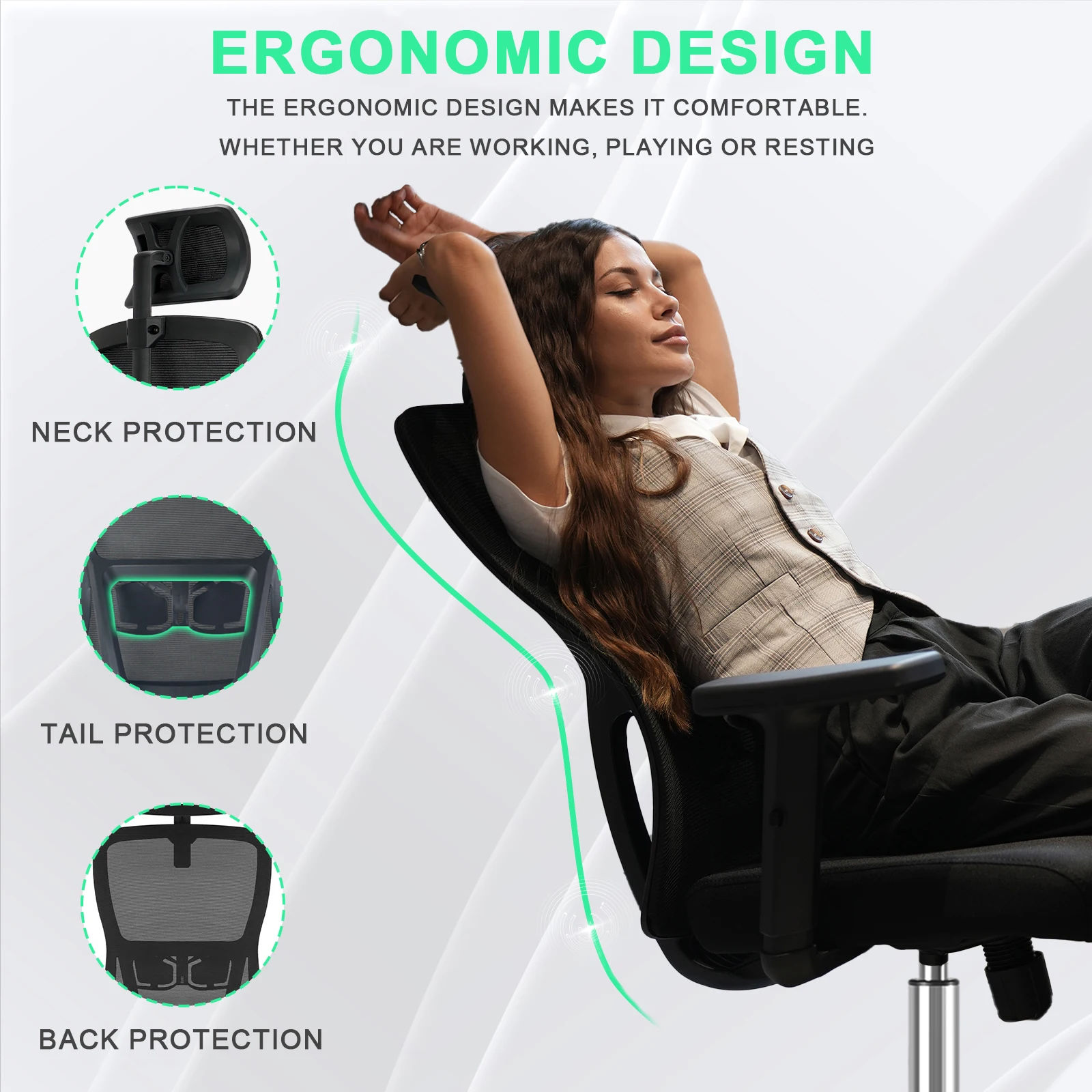 Lo schienale a forma di S si adatta alla curva della colonna vertebrale umana e il cuscino lombare regolabile fornisce più supporto per la parte bassa della schiena.Il tessuto a rete della sedia da ufficio con schienale alto è traspirante, confortevole e resistente.Il poggiatesta ha un intervallo di regolazione dell’altezza di 10 cm e può essere girato per adattarsi alla testa e al collo, rilassarsi al corpo e allevia l’affaticamento.
