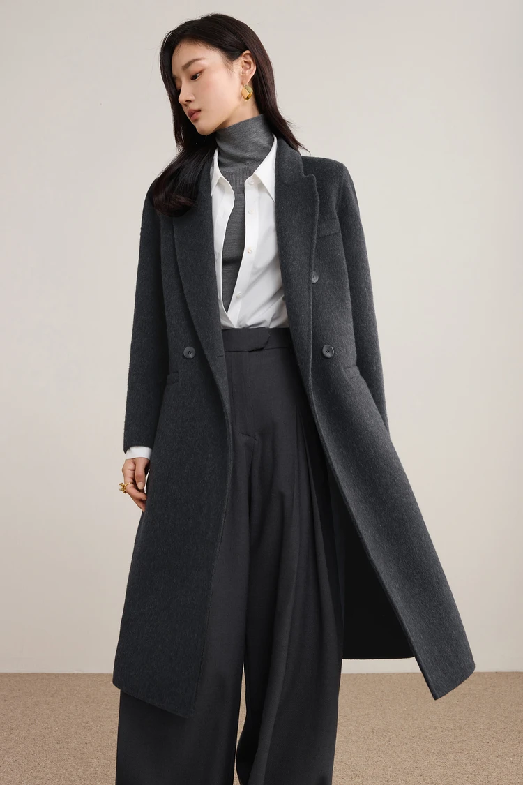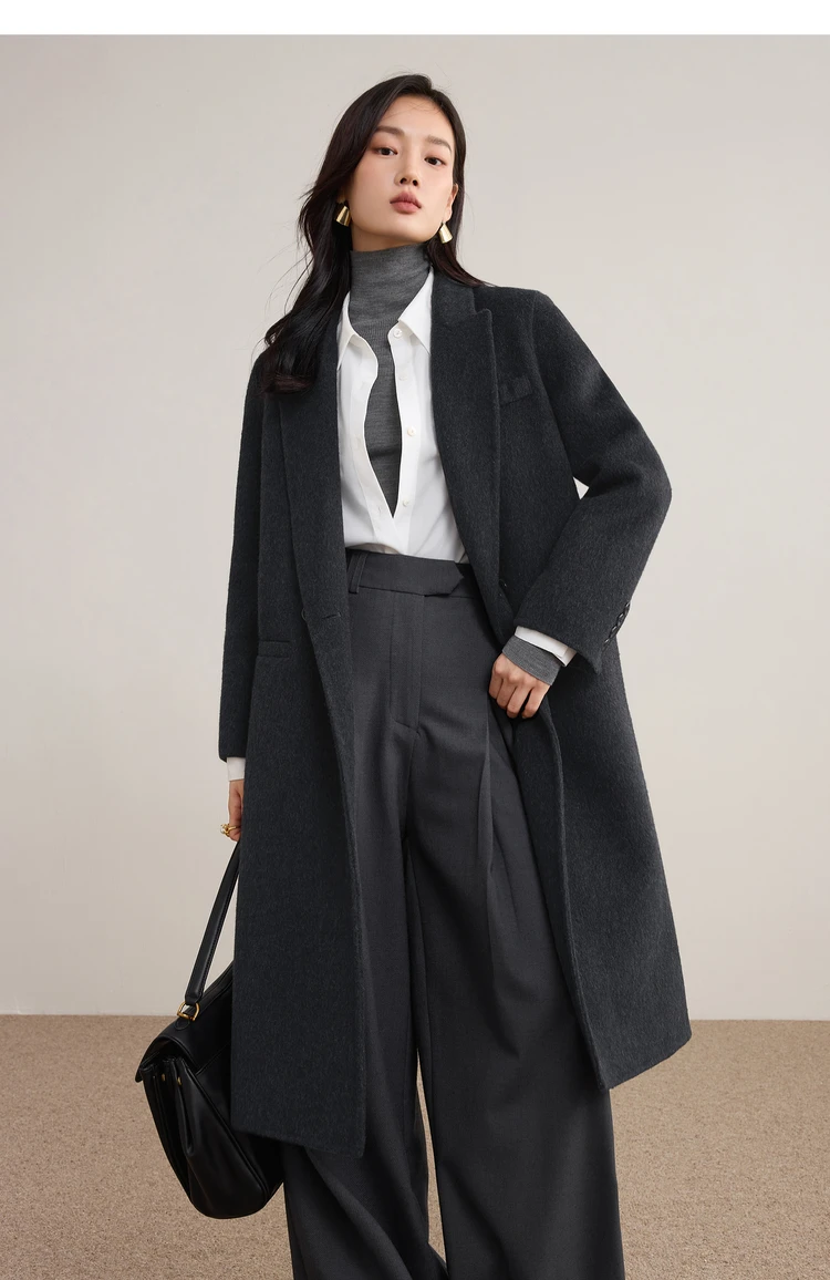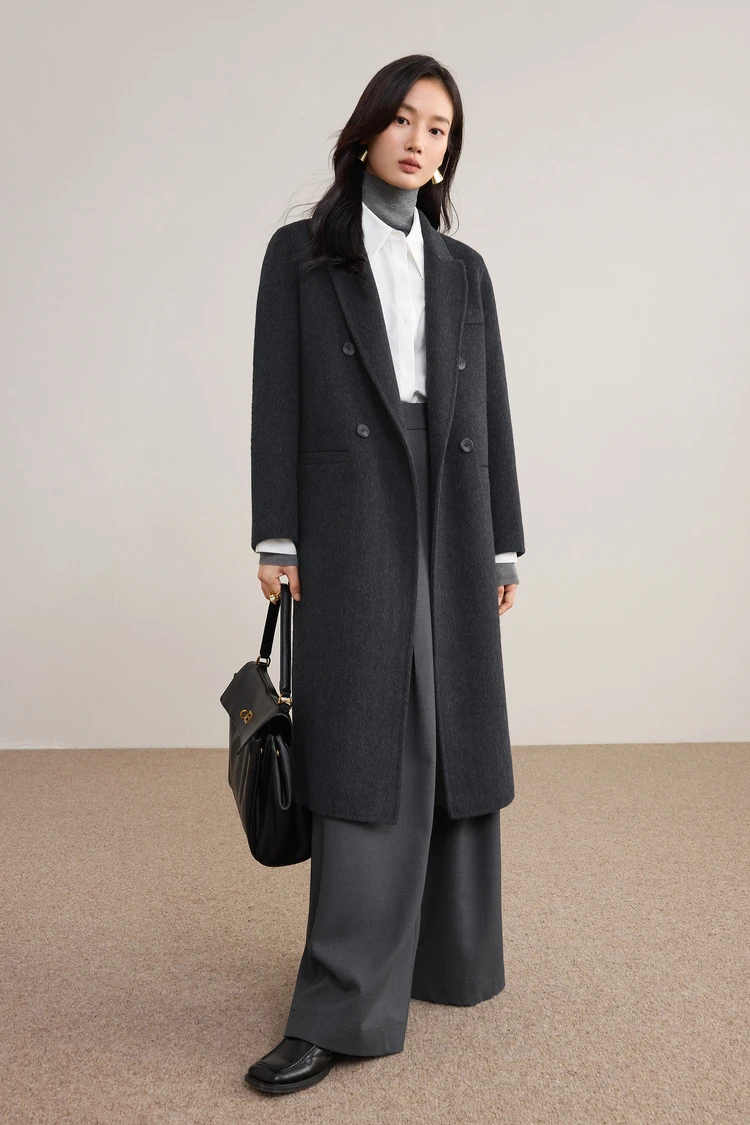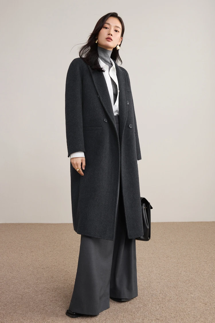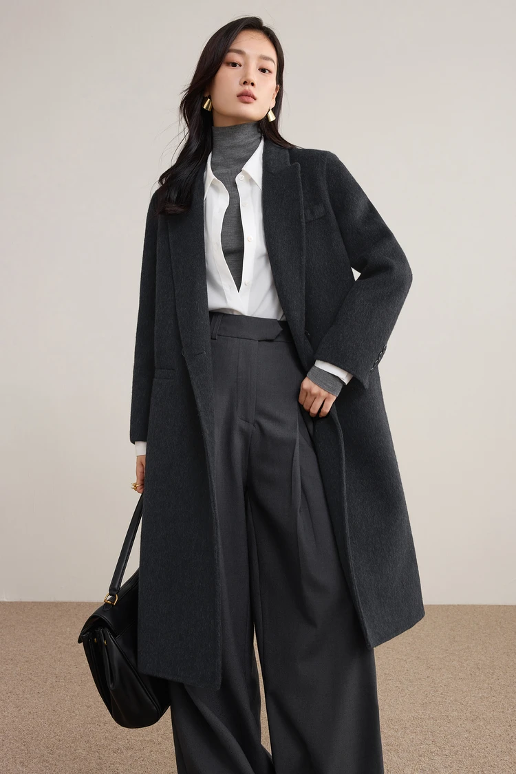 Cappotto di lana su misura di ispirazione britannicaPresenta un classico revers inglese con visiera per un look netto e raffinato.Il rilassato taglio architettonico di media lunghezza avvolge il corpo comodamente senza ingombro, consentendo una facile stratificazione pur mantenendo una presenza potente.Realizzato in morbida lana d’oro da 65 pezzi da 900 g per un calore che ti accompagna con sicurezza dagli spostamenti alle occasioni formali. Silhouette architettonica rilassata di media lunghezzaFornisce una presenza impegnativa con una forma sottile: nasconde mentre è lusinghiero, si strati dolcemente senza volume aggiunto Risvolto in punta su misura ingleseFlatte il viso con un drappeggio elegante e raffinato: è piatto con una curva naturale Pulsanti decorativi a doppia fila a contrastoMeticolosamente allineato per l’armonia visiva: funzionale e raffinato Tasche laterali discretePerfetto per riporre o riscaldare le mani: rifinito con precisione per un aspetto pulito