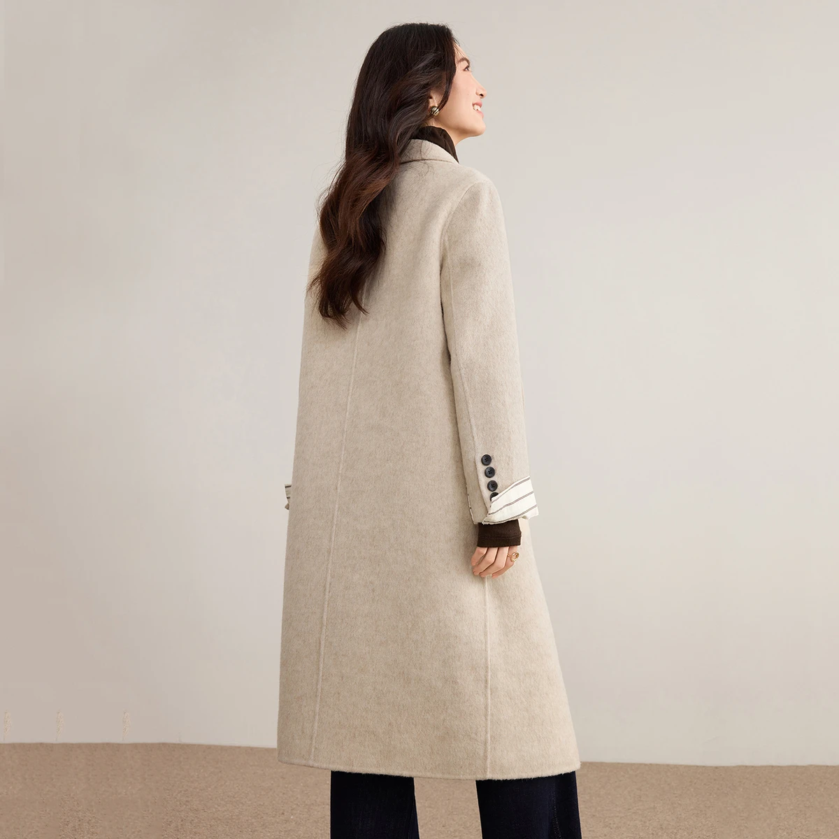 Cappotto di lana su misura di ispirazione britannicaPresenta un classico revers inglese con visiera per un look netto e raffinato.Il rilassato taglio architettonico di media lunghezza avvolge il corpo comodamente senza ingombro, consentendo una facile stratificazione pur mantenendo una presenza potente.Realizzato in morbida lana d’oro da 65 pezzi da 900 g per un calore che ti accompagna con sicurezza dagli spostamenti alle occasioni formali. Silhouette architettonica rilassata di media lunghezzaFornisce una presenza impegnativa con una forma sottile: nasconde mentre è lusinghiero, si strati dolcemente senza volume aggiunto Risvolto in punta su misura ingleseFlatte il viso con un drappeggio elegante e raffinato: è piatto con una curva naturale Pulsanti decorativi a doppia fila a contrastoMeticolosamente allineato per l’armonia visiva: funzionale e raffinato Tasche laterali discretePerfetto per riporre o riscaldare le mani: rifinito con precisione per un aspetto pulito