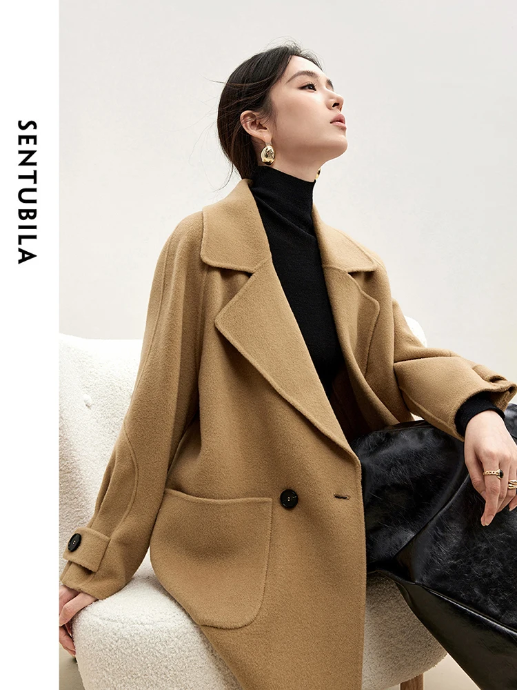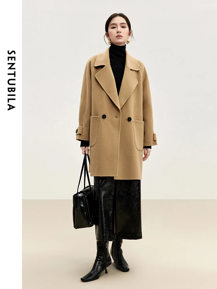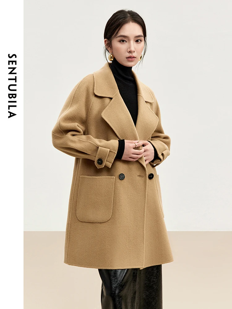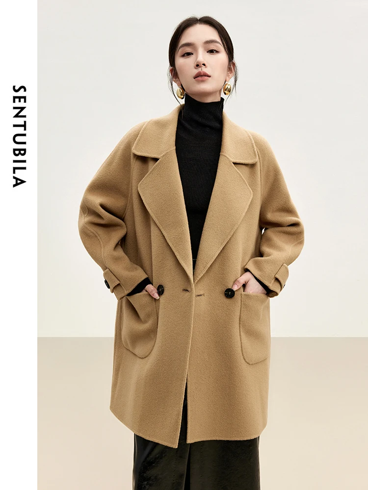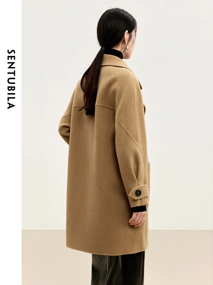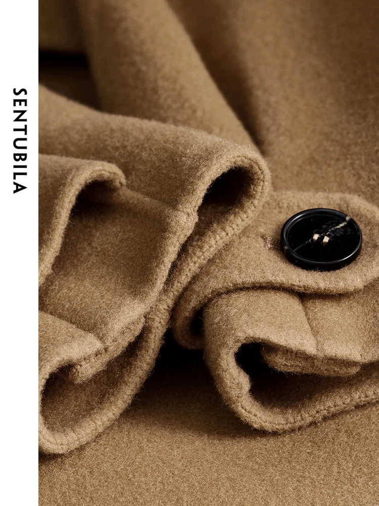 SENTUBILA Texture 100% Cappotto di lana Giacche per le donne 2025 Moda invernale Solid Grandi tasche Cappotti caldi di media lunghezza W44O56016