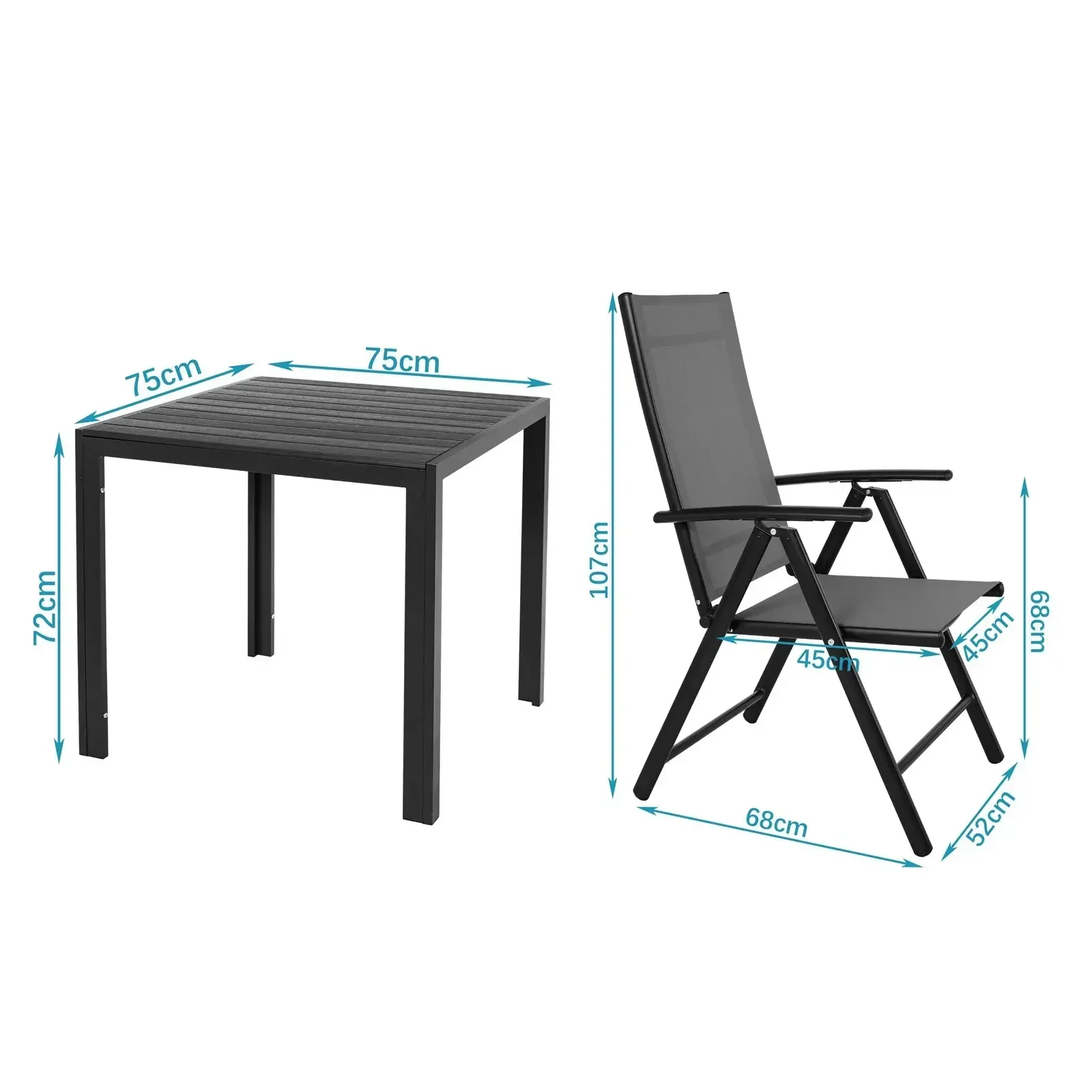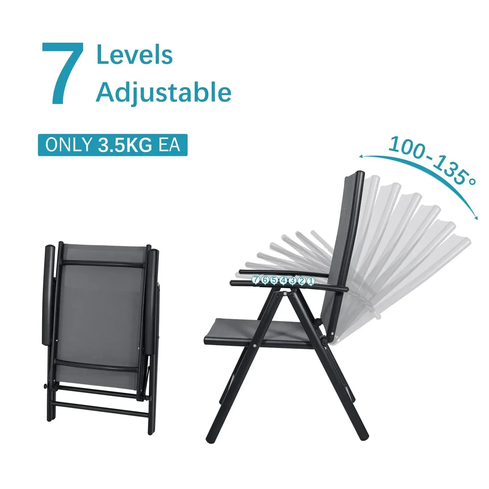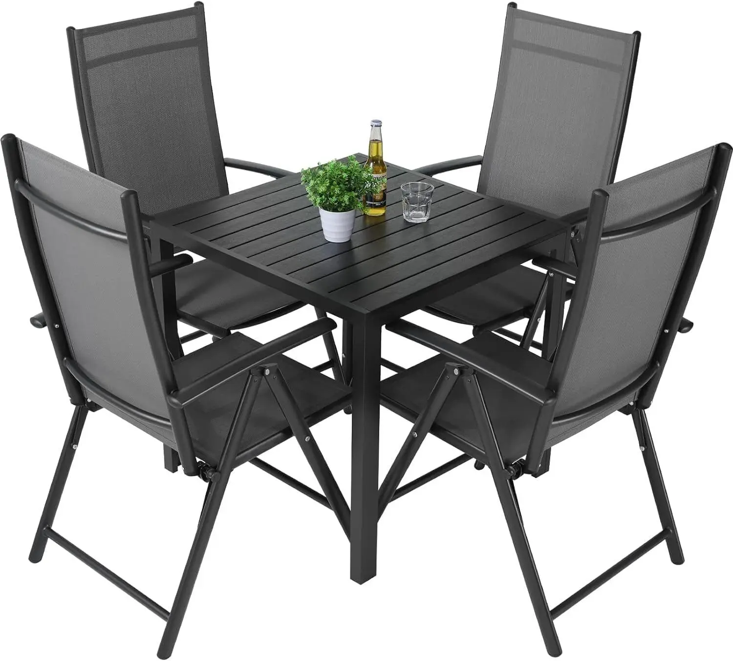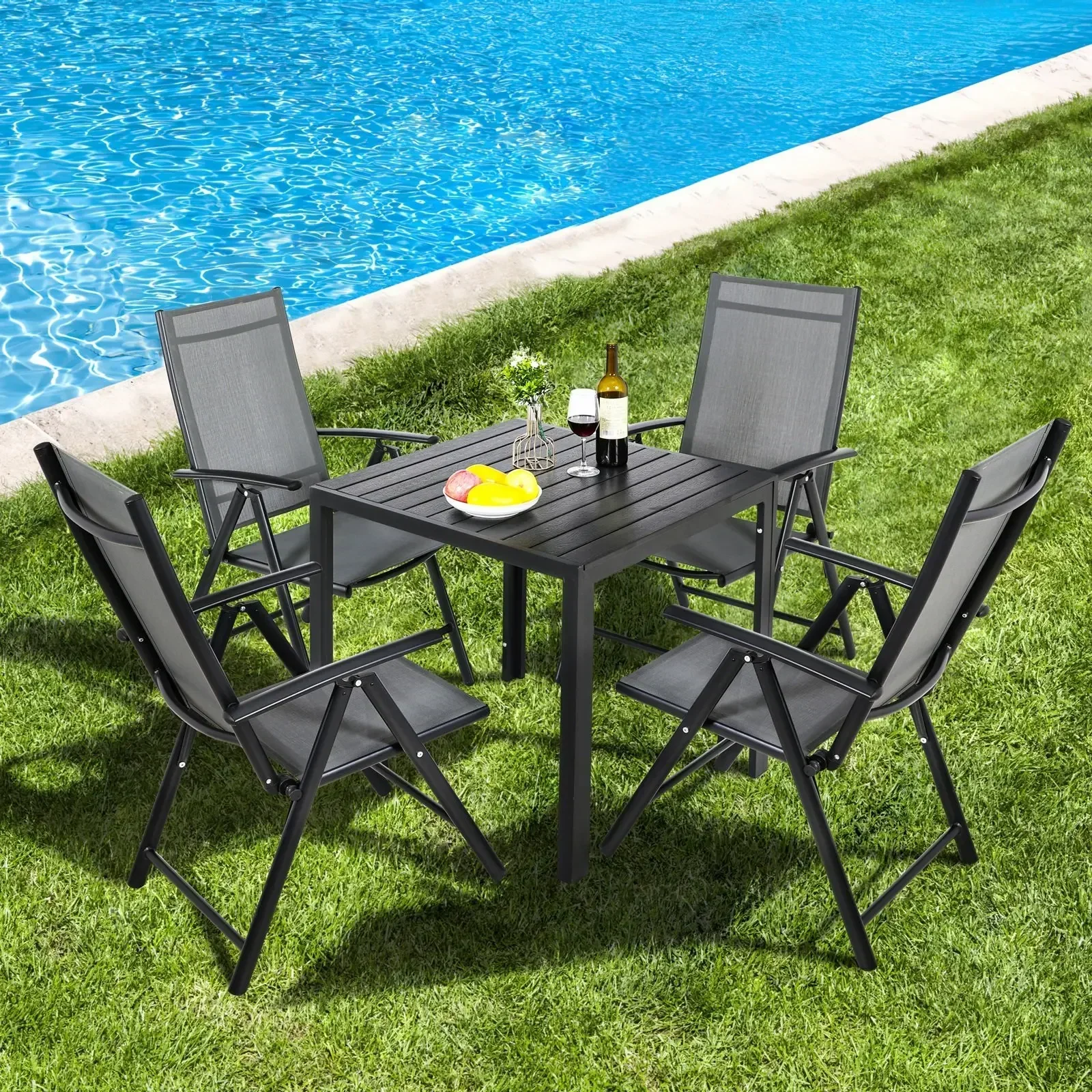 Set da balcone da 5 pezzi Mobili da giardino Sedute in alluminio Tavolo da giardino 4 sedie pieghevoli Mobili da giardino con schienale alto regolabile a 7 vie Nero, Grigio, Colore legno
