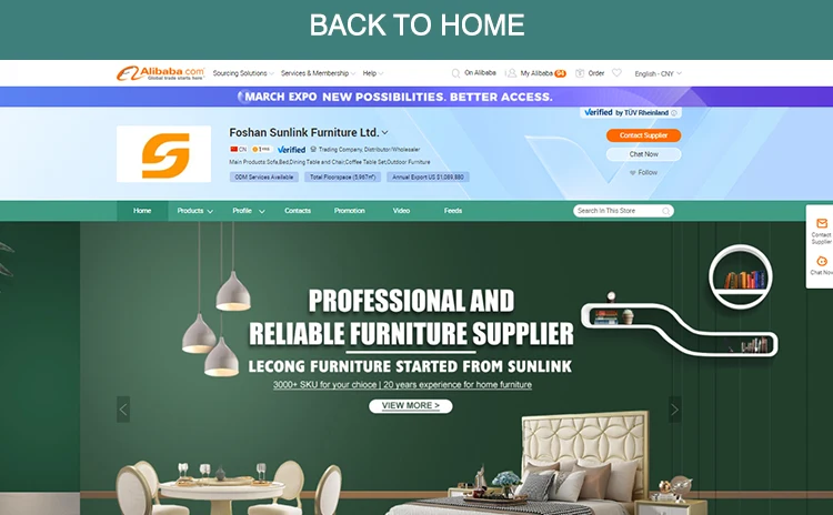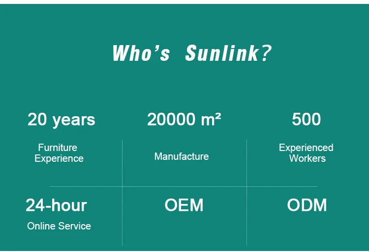 Informazioni su noi Foshan Sunlink Furniture Ltd. situato nella zona chiave di Lecong Foshan che è stato chiamato la città dei mobili del mondo.È un sussidio di SUNLINK GROUP che è stato trovato nel 1987, si concentra ai mobili.