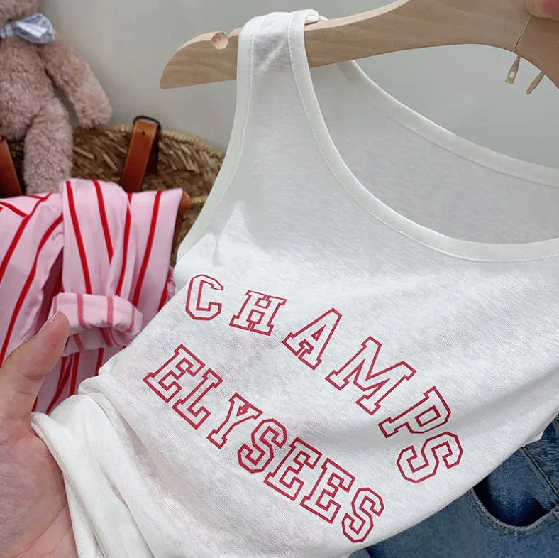 Set di abbigliamento per bambini Camicia a maniche lunghe a righe + Gilet stampato con monogramma + Pantaloncini di jeans 3 pezzi Vestiti per bambini Ragazza da 3 a 7 anni