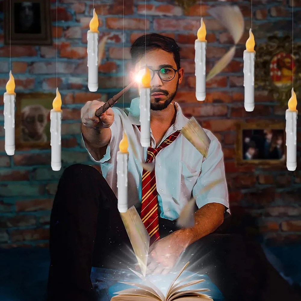 1 set di luci a candela con bacchetta magica levitante (12 luci a candela elettroniche, 1 bacchetta magica, 10 ganci adesivi, 1 lenza)