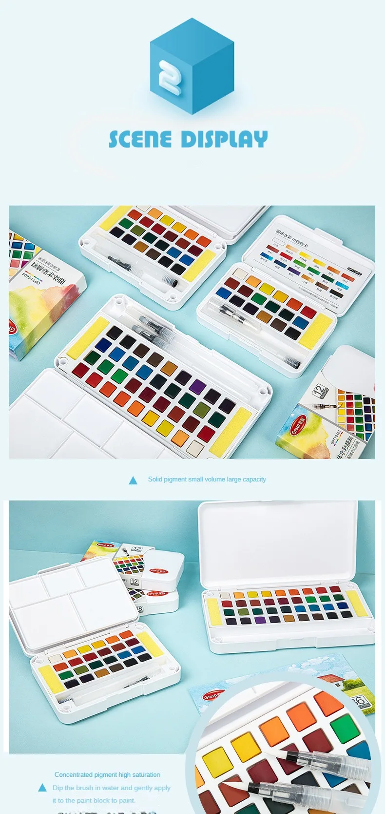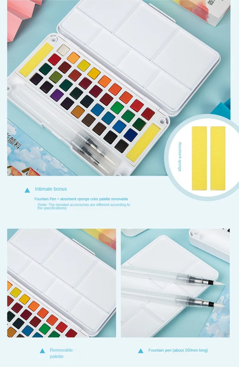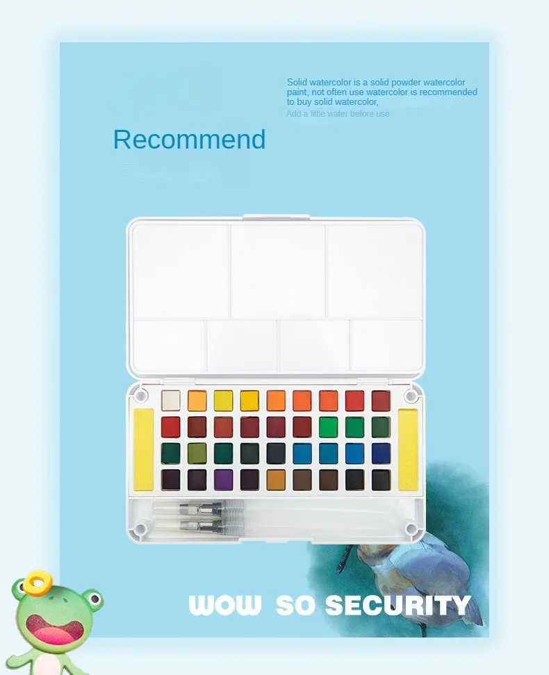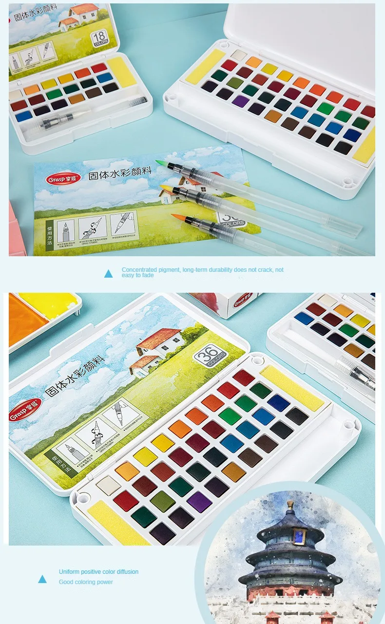 Colori ad acquerello secchi, non colori professionali, poiché alcuni sbiadiscono un po’. Buono per l’inizio o durante il viaggio, soprattutto per il prezzo. Viene fornito con una buona spazzola con un serbatoio d’acqua e una spugna in una scatola chiudibile. Purtroppo si chiude solo molto allentamente, potrebbe essere un po’ più stretto.