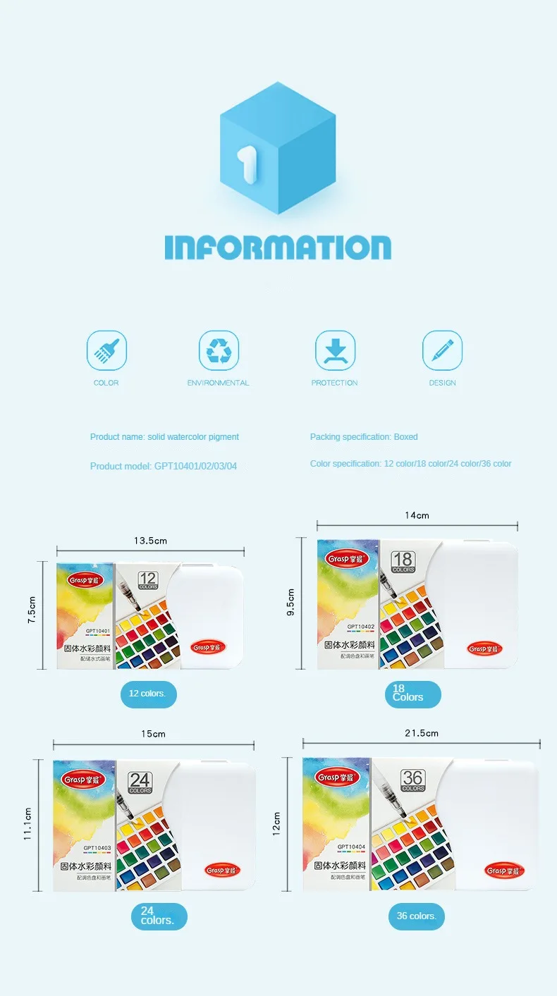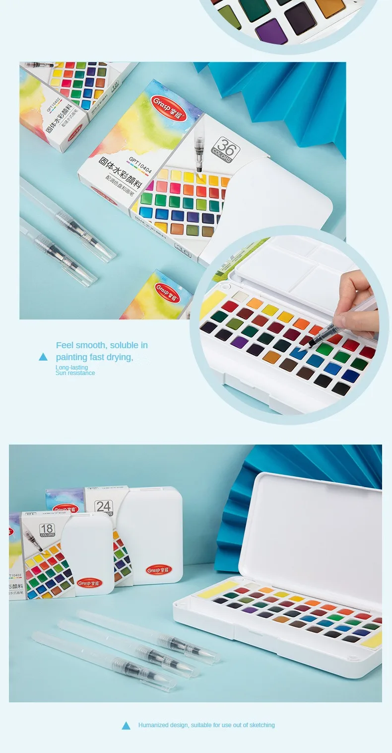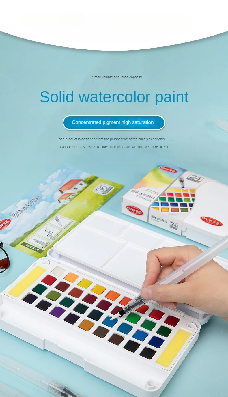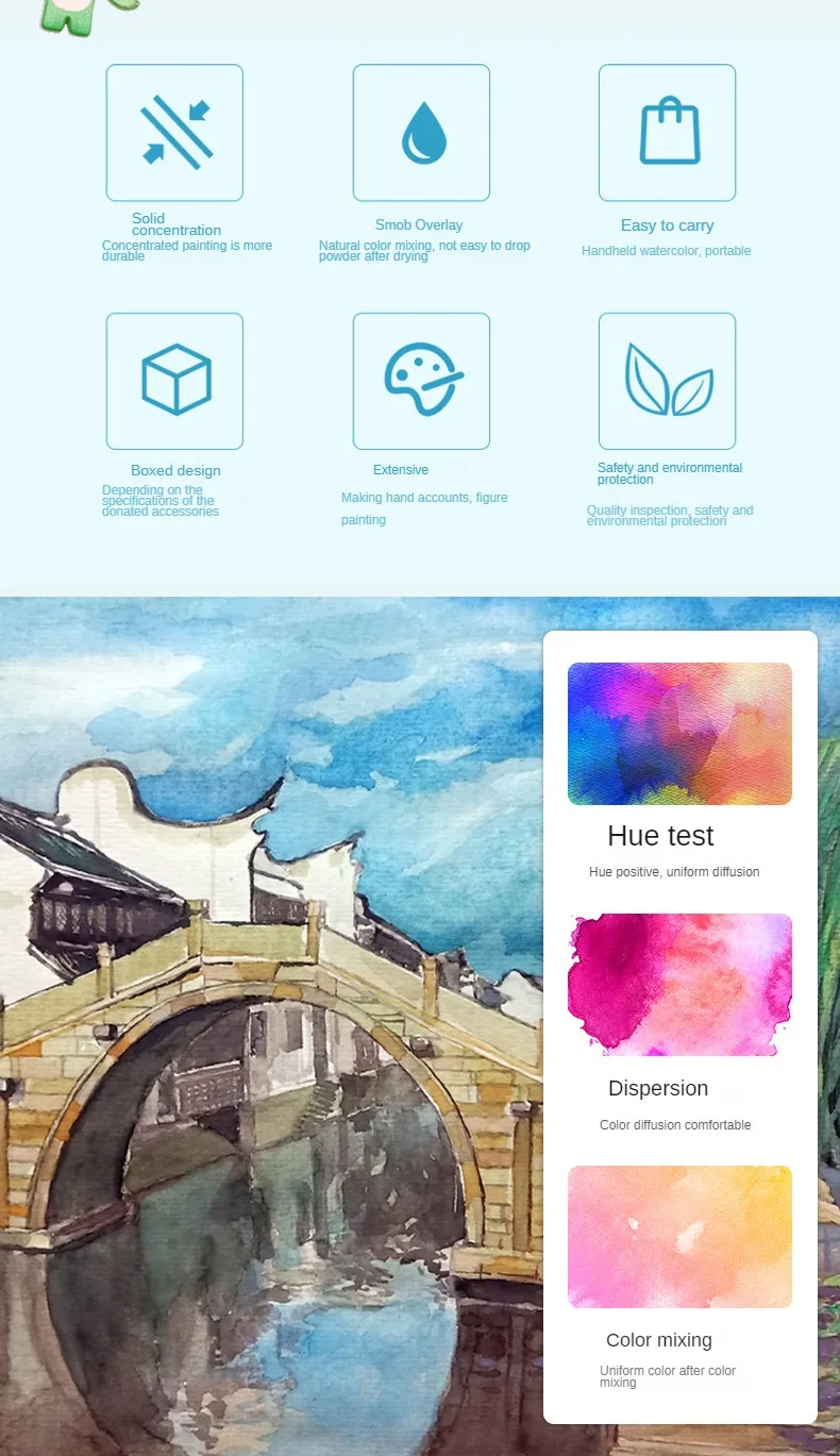 Colori ad acquerello secchi, non colori professionali, poiché alcuni sbiadiscono un po’. Buono per l’inizio o durante il viaggio, soprattutto per il prezzo. Viene fornito con una buona spazzola con un serbatoio d’acqua e una spugna in una scatola chiudibile. Purtroppo si chiude solo molto allentamente, potrebbe essere un po’ più stretto.