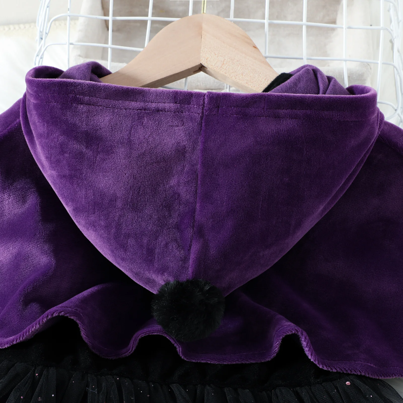 Tessuti di lusso: Il morbido velluto (cappuccio + corpetto del vestito) garantisce intimità; il tulle glitterato aggiunge brillantezza senza irritazioni.