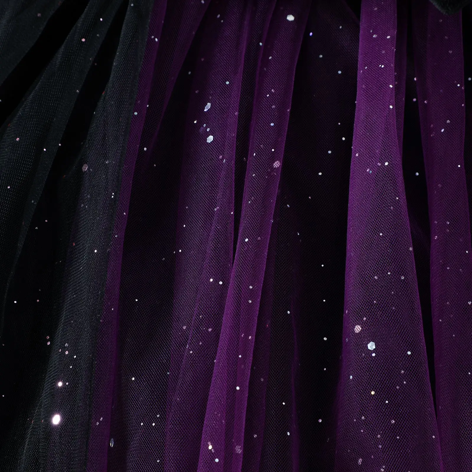 Tulle stellato: Gli strati di tulle scintillanti con scintillii sparsi imitano un cielo notturno, perfetto per la magia di Halloween.