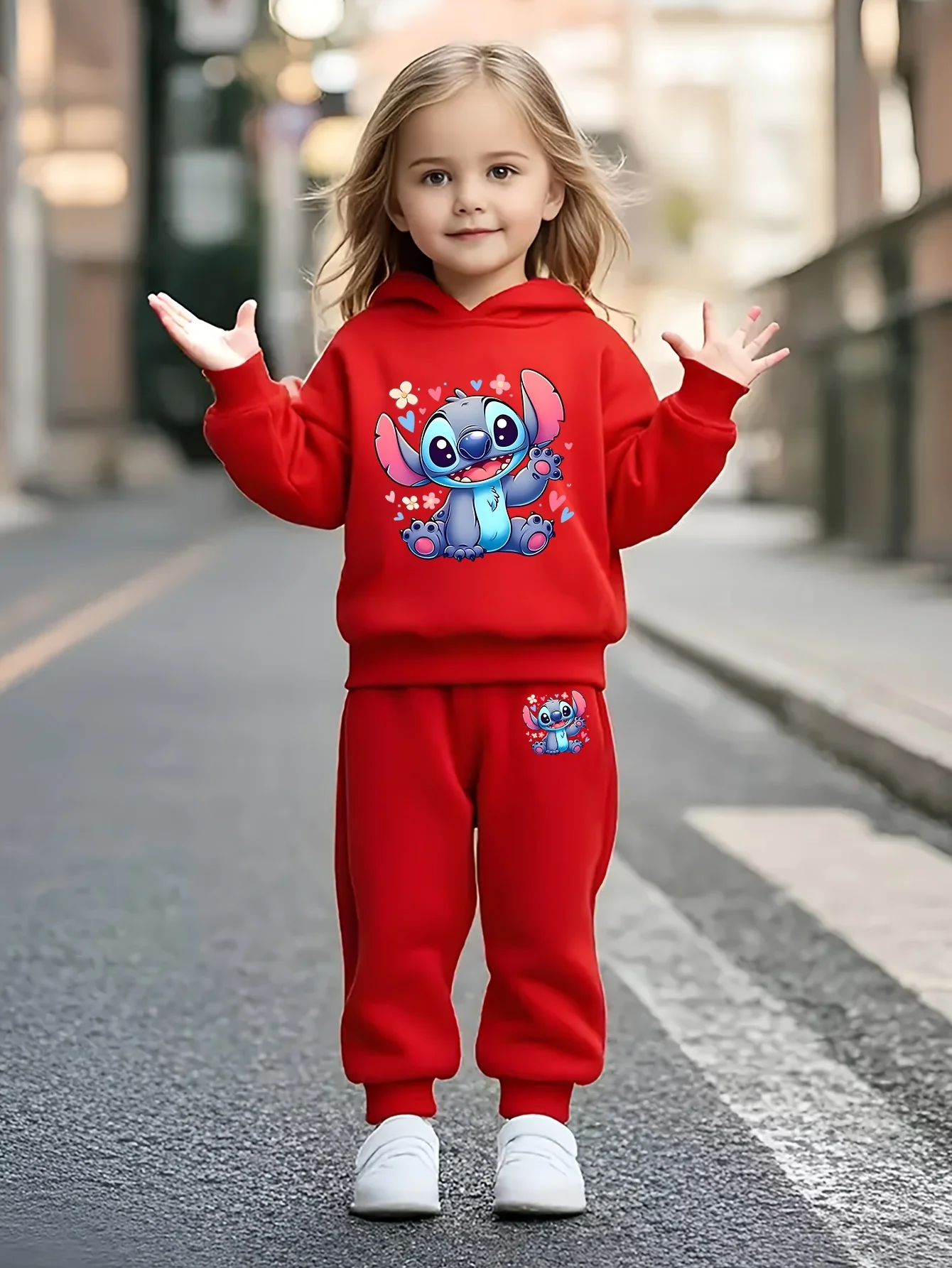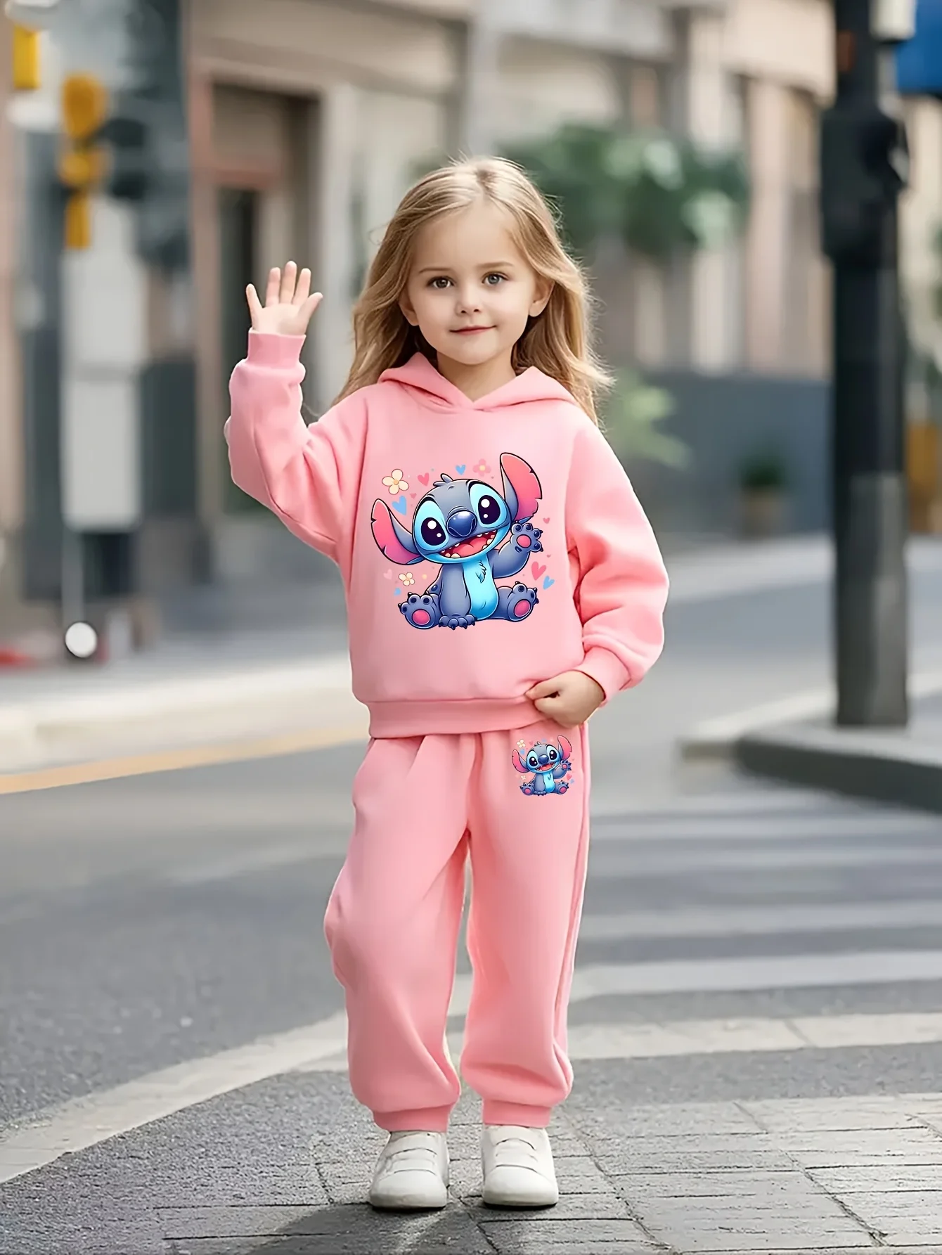 Set di pantaloni in peluche autunnali e invernali per bambini con stampa cartoon Disney Stitch, felpa sportiva casual in 2 pezzi per ragazzi e ragazze