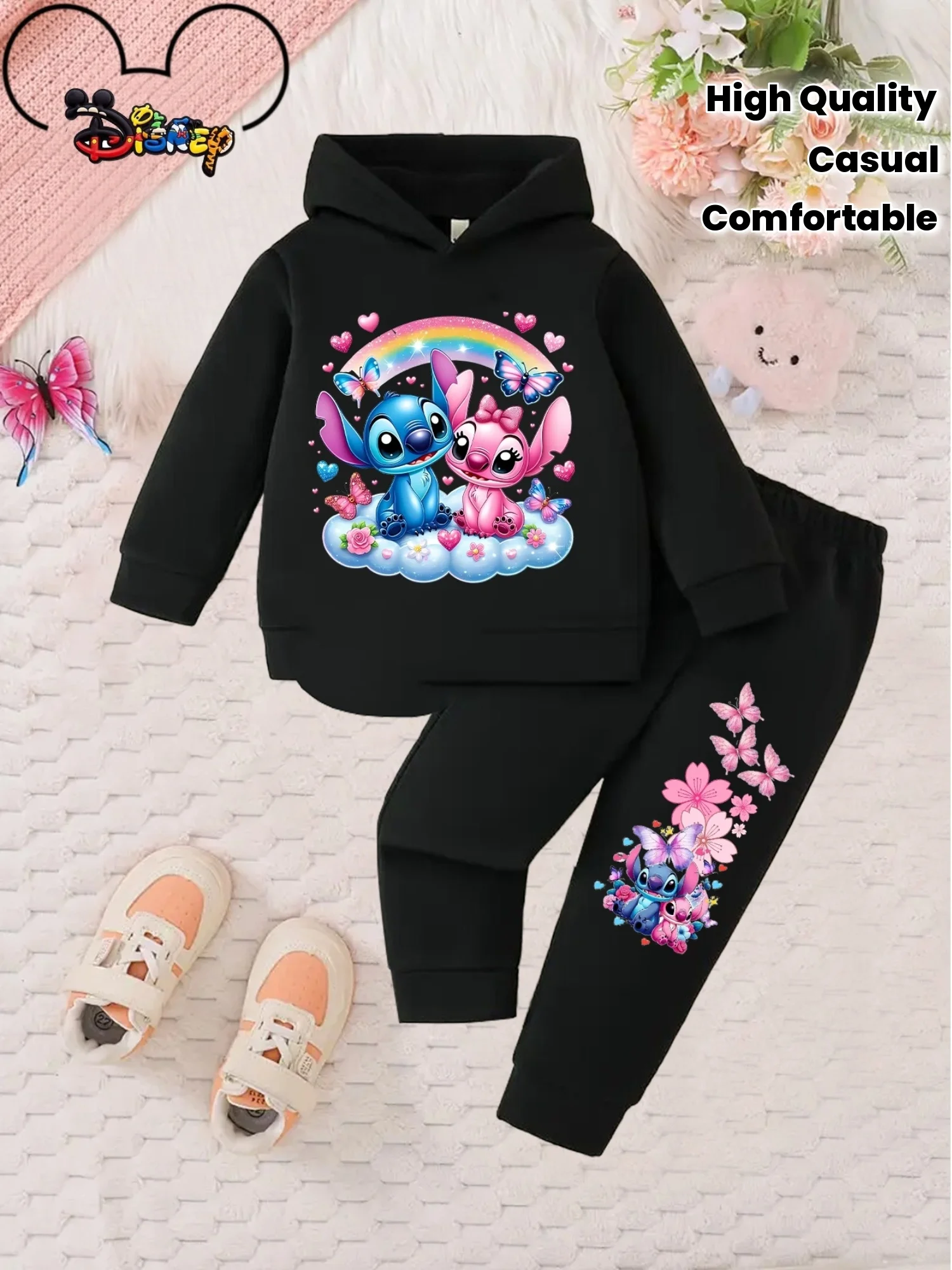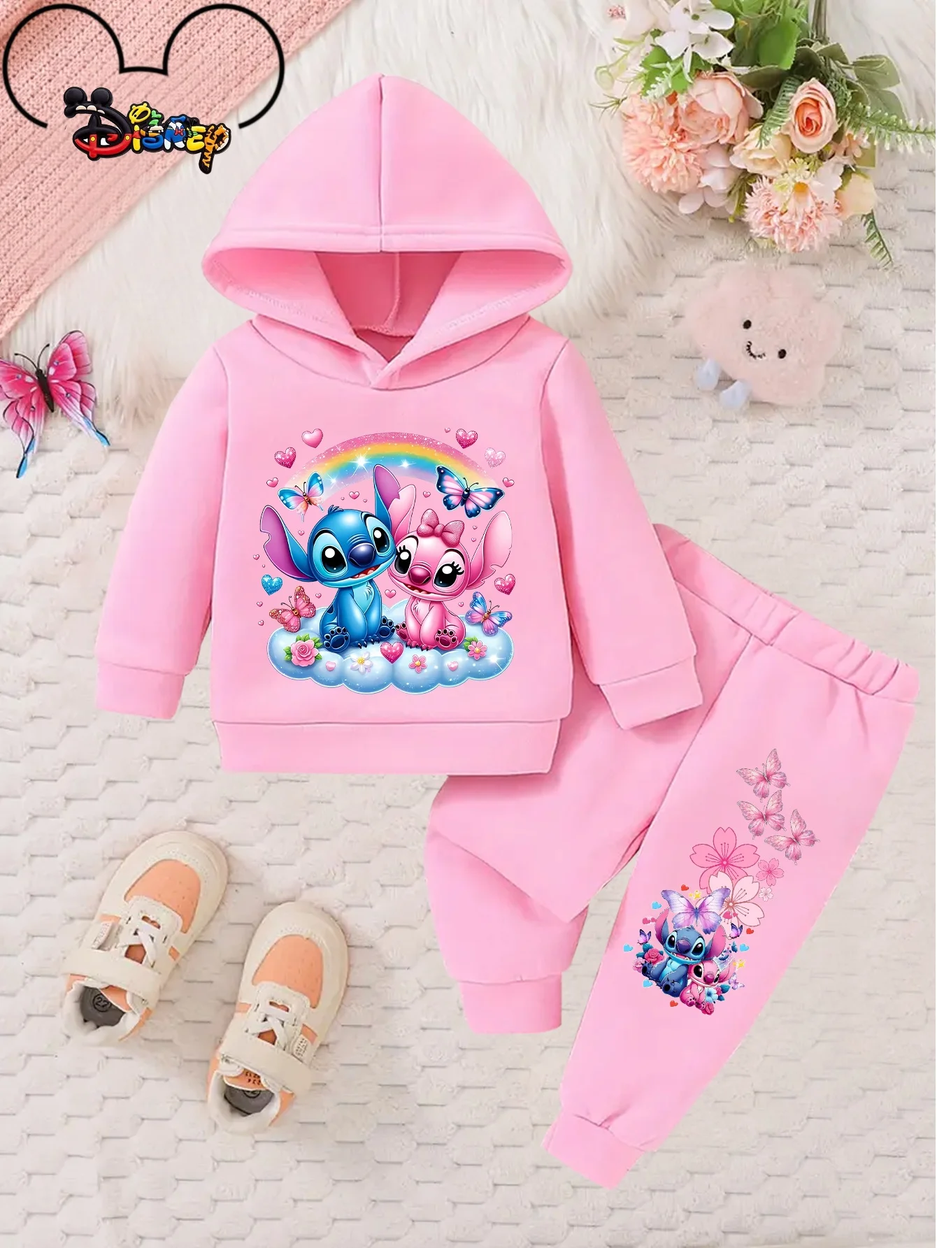 Set di pantaloni in peluche autunnali e invernali per bambini con stampa cartoon Disney Stitch, felpa sportiva casual in 2 pezzi per ragazzi e ragazze