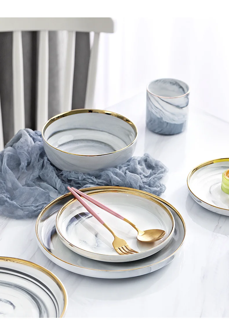 Set di piatti e ciotole in ceramica di marmo, set di stoviglie, piatti natalizi, vassoio rotondo, insalata, dessert, ossa, piatti bianchi in porcellana, cucina
