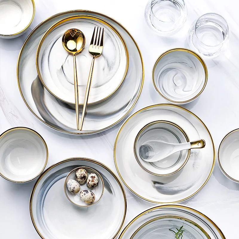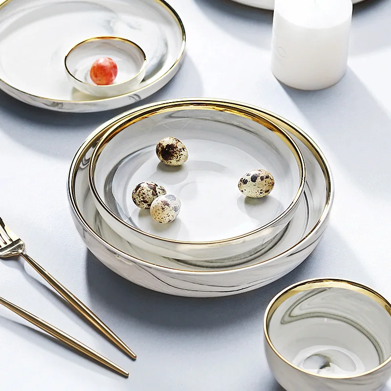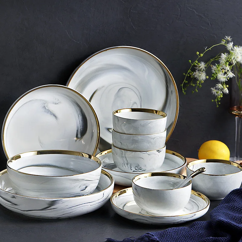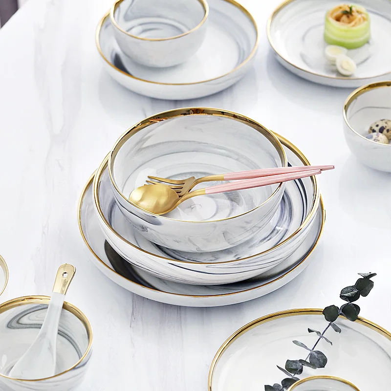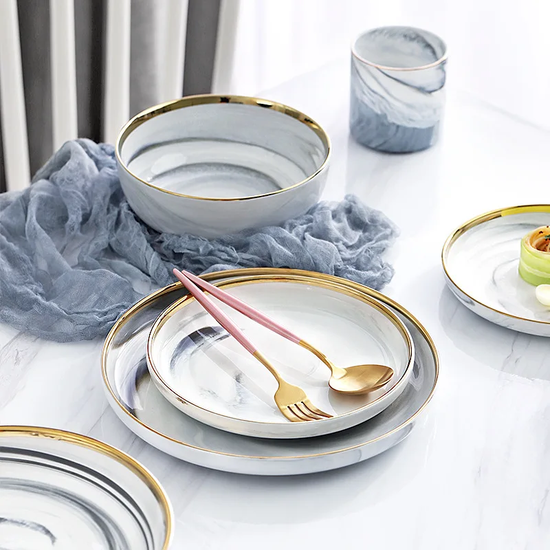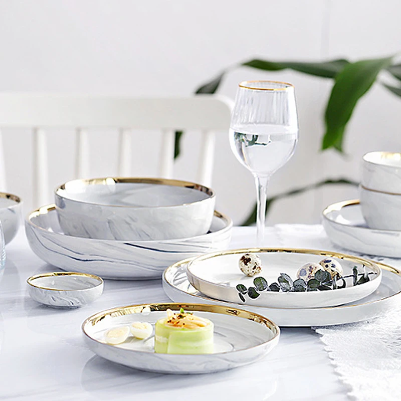 Set di piatti e ciotole in ceramica di marmo, set di stoviglie, piatti natalizi, vassoio rotondo, insalata, dessert, ossa, piatti bianchi in porcellana, cucina