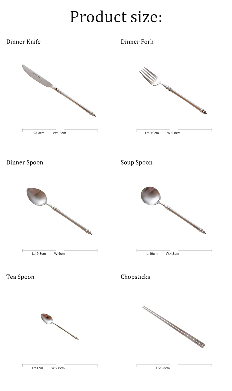 * Materiale: acciaio inossidabile 304 * Colore: argento opaco * Modello: coltello da tavola, forchetta da pranzo, cucchiaio da tavola, cucchiaio da minestra, cucchiaio da tè, bacchette
