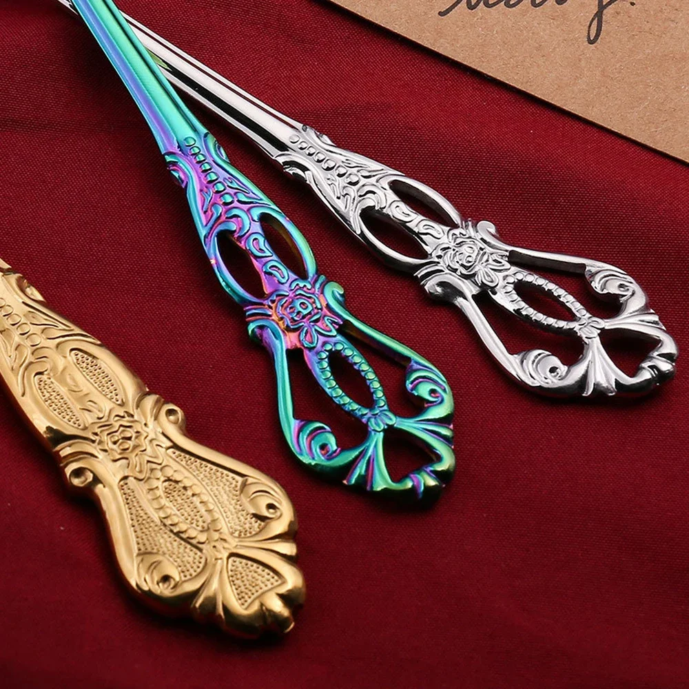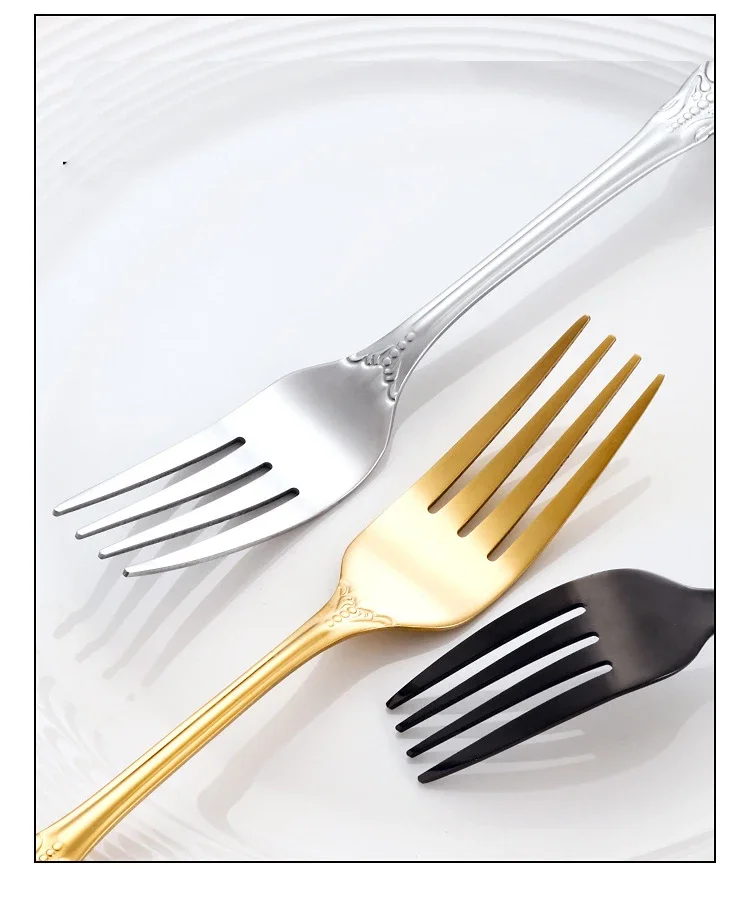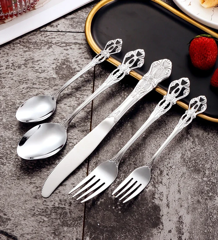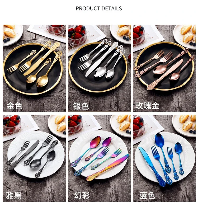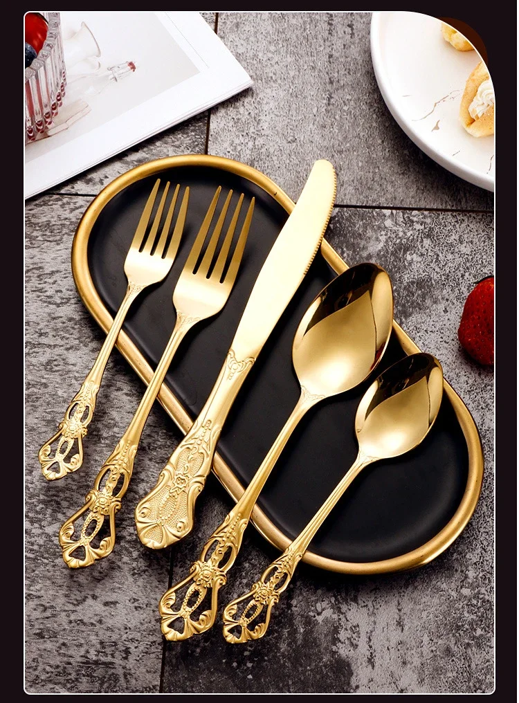 Set di posate in oro retrò Stoviglie complete di lusso Stile europeo Cucchiaio in acciaio inossidabile Forchetta Coltello da bistecca Set di stoviglie Confezione regalo