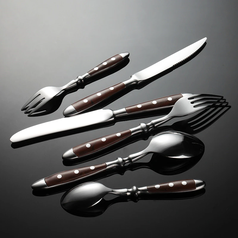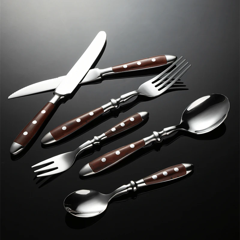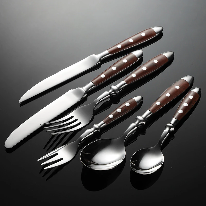 Caratteristiche: 1, motivo a stella — stile rivetto classico in stile occidentale, retrò ed elegante, adatto per la decorazione del desktop per occasioni di cena formale nei ristoranti. Acciaio inossidabile 2,430 —- è sicuro e inodore, resistente alle alte temperature e resistente alla corrosione, certificato LFGB, soddisfa i requisiti del contatto cutaneo e non danneggia la pelle. 3, Western —- le stoviglie in stile classico sono uno strumento di cottura essenziale per ristoranti prima dei pasti. Con un cucchiaio, puoi avere un pasto piacevole. 4, comodo —- design ergonomico, comoda impugnatura in legno, curvatura liscia dell’estremità anteriore della forcella, non sarà la lingua, adatta ai bambini. Materiale: acciaio inossidabile 430 e legno di bachelite