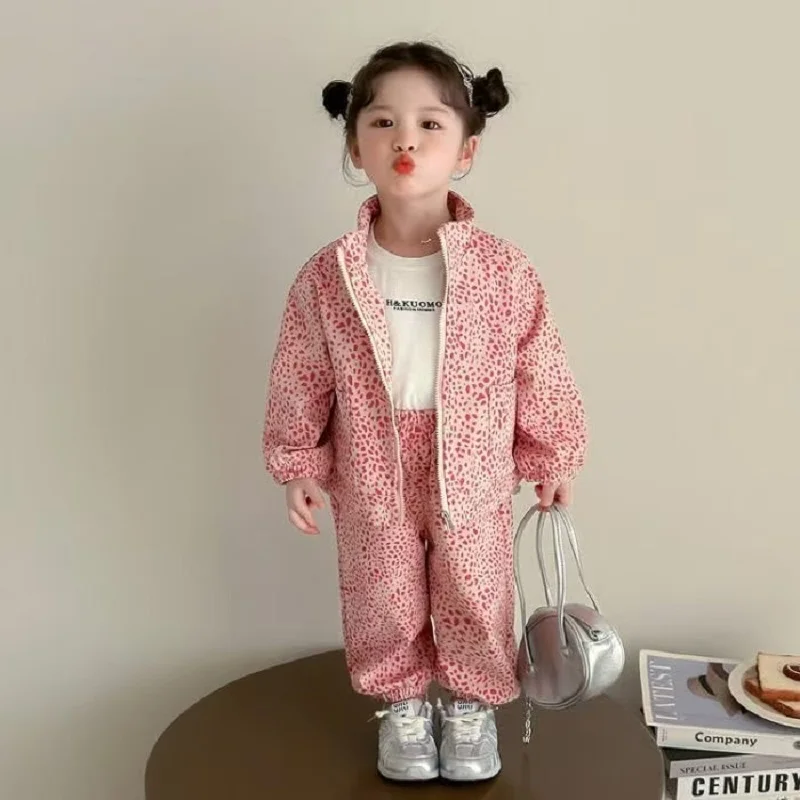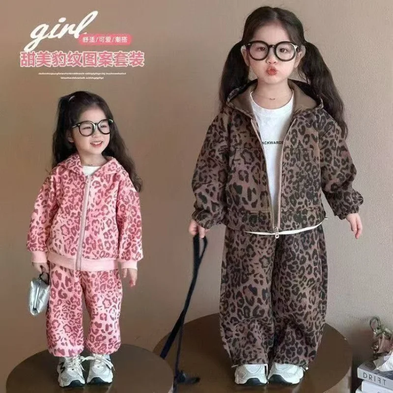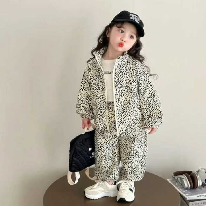 Set di vestiti per bambina autunno Bambini Ragazzo Giacca con cerniera con stampa leopardata e pantaloni a gamba larga BottomTuta in cotone da due pezzi
