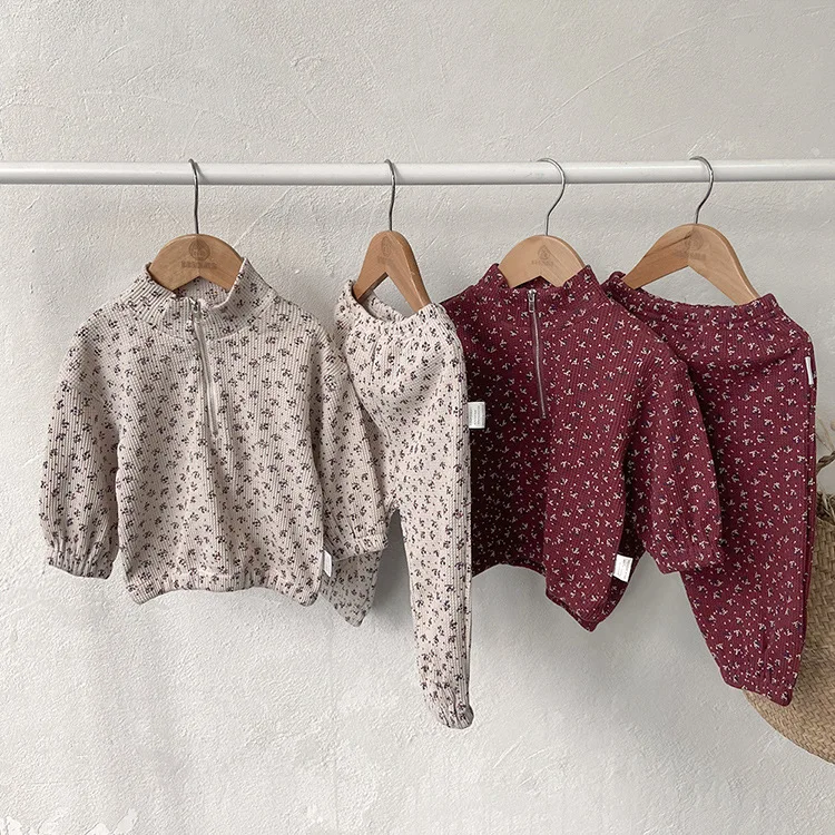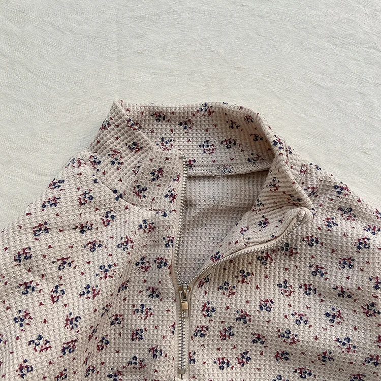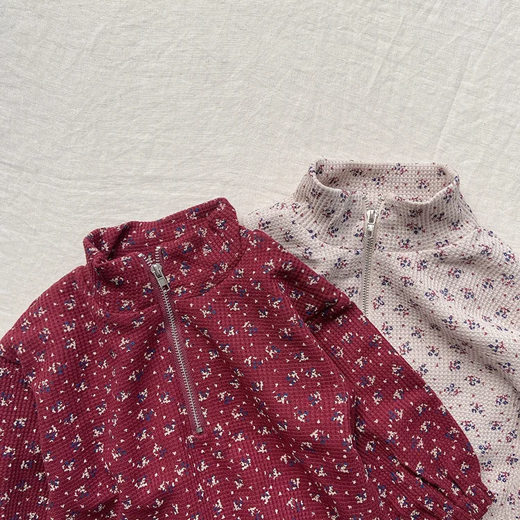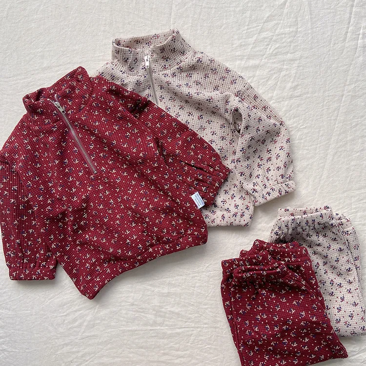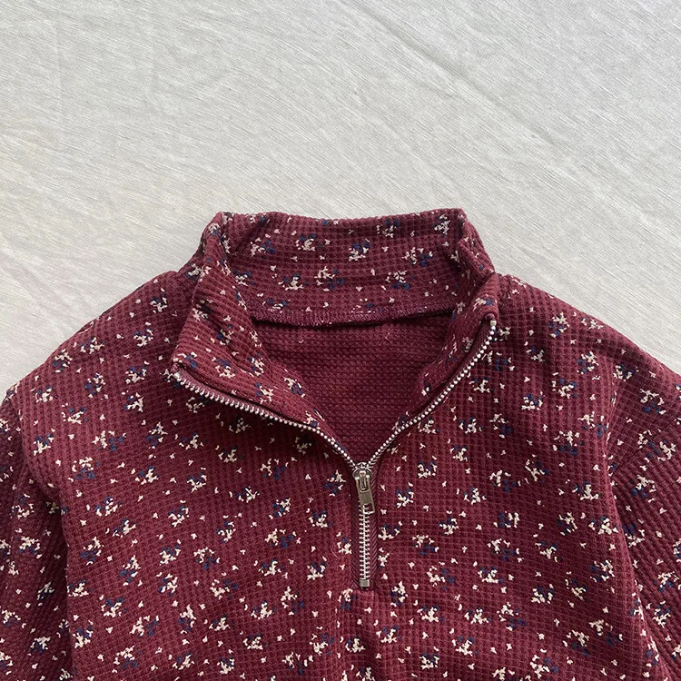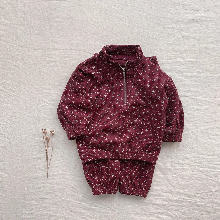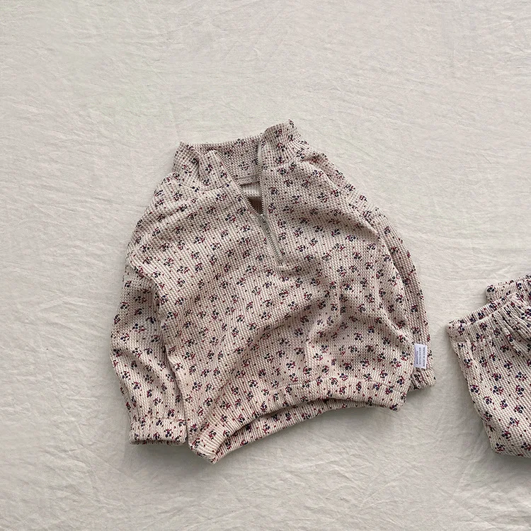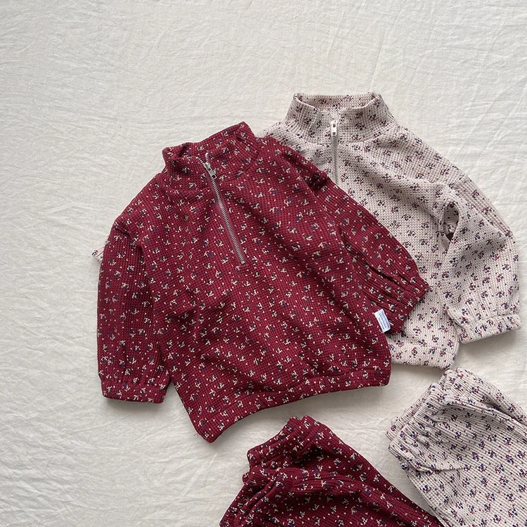 ### Punti salienti del set di waffle in cotone per bambini 1.**Tessuto waffle di cotone morbido**: Realizzato in waffle traspirante e accogliente – cotone strutturato.Perfetto per bambini da 1 a 5 anni, garantisce comfort per l’uso quotidiano e le gite. 2.**Design floreale retrò e mezza zip**: motivi floreali vintage, felpe con mezza zip e pantaloni abbinati.Aggiunge un’atmosfera elegante e nostalgica: si distingue per look casual. 3. **Versatilità facile da abbinare**: ideale per la primavera/autunno. Il set coordinato semplifica l’abbigliamento, la combinazione e l’abbinamento amichevole, consentendo ai bambini di muoversi liberamente in uno stile carino e retrò.