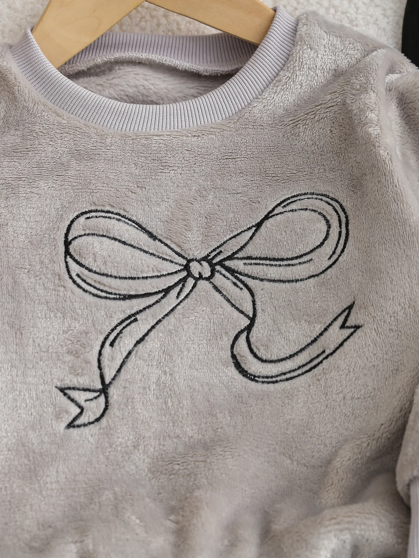Set elegante e caldo per ragazze autunnali e invernali: top in morbida pelliccia ricamata con fiocco da bambina + pantaloni lunghi Set da 2 pezzi