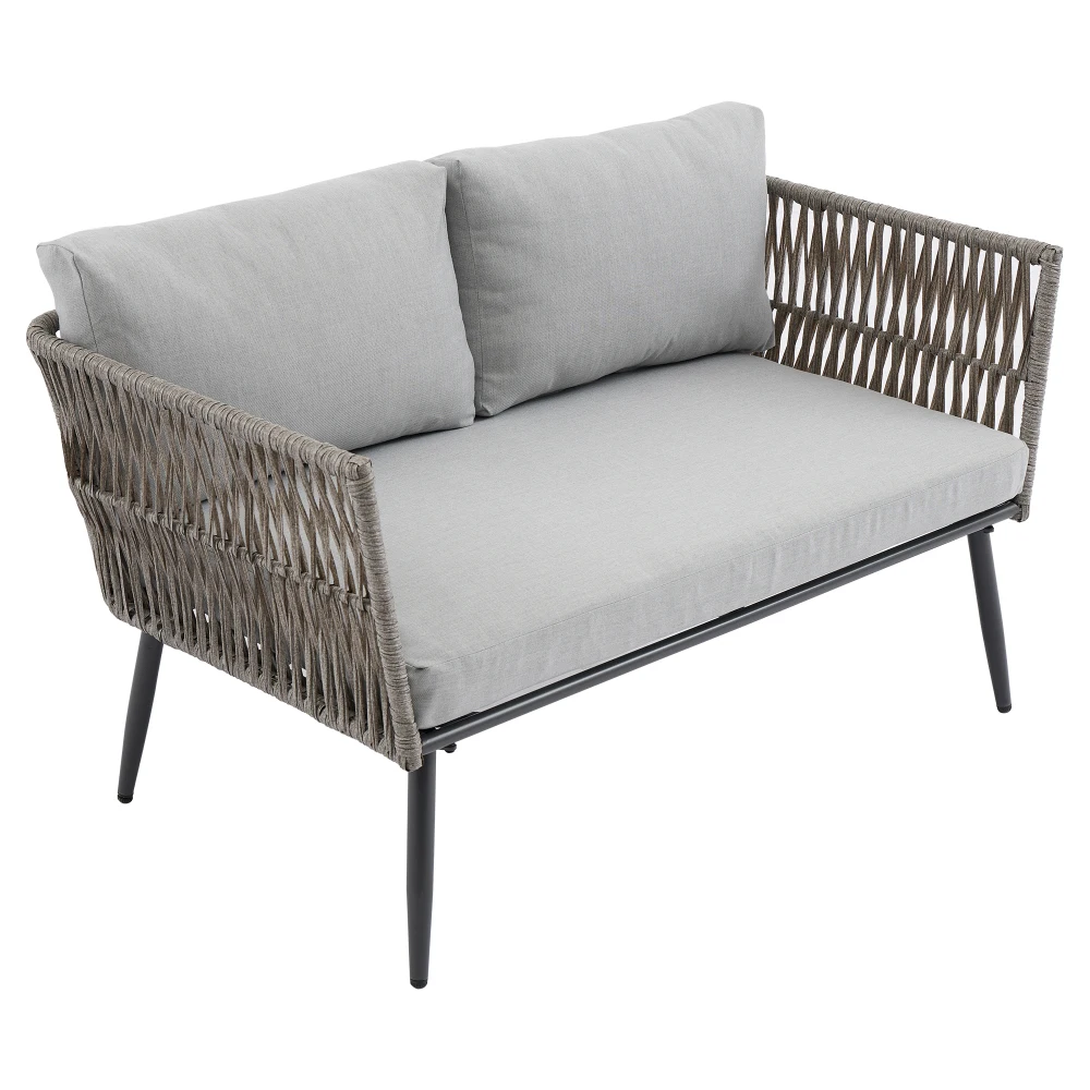 Set Lounge da giardino con divano a 2 posti, 2 poltrone e tavolino-PE intrecciato e acciaio zincato (cuscini in vetro nero/grigio)