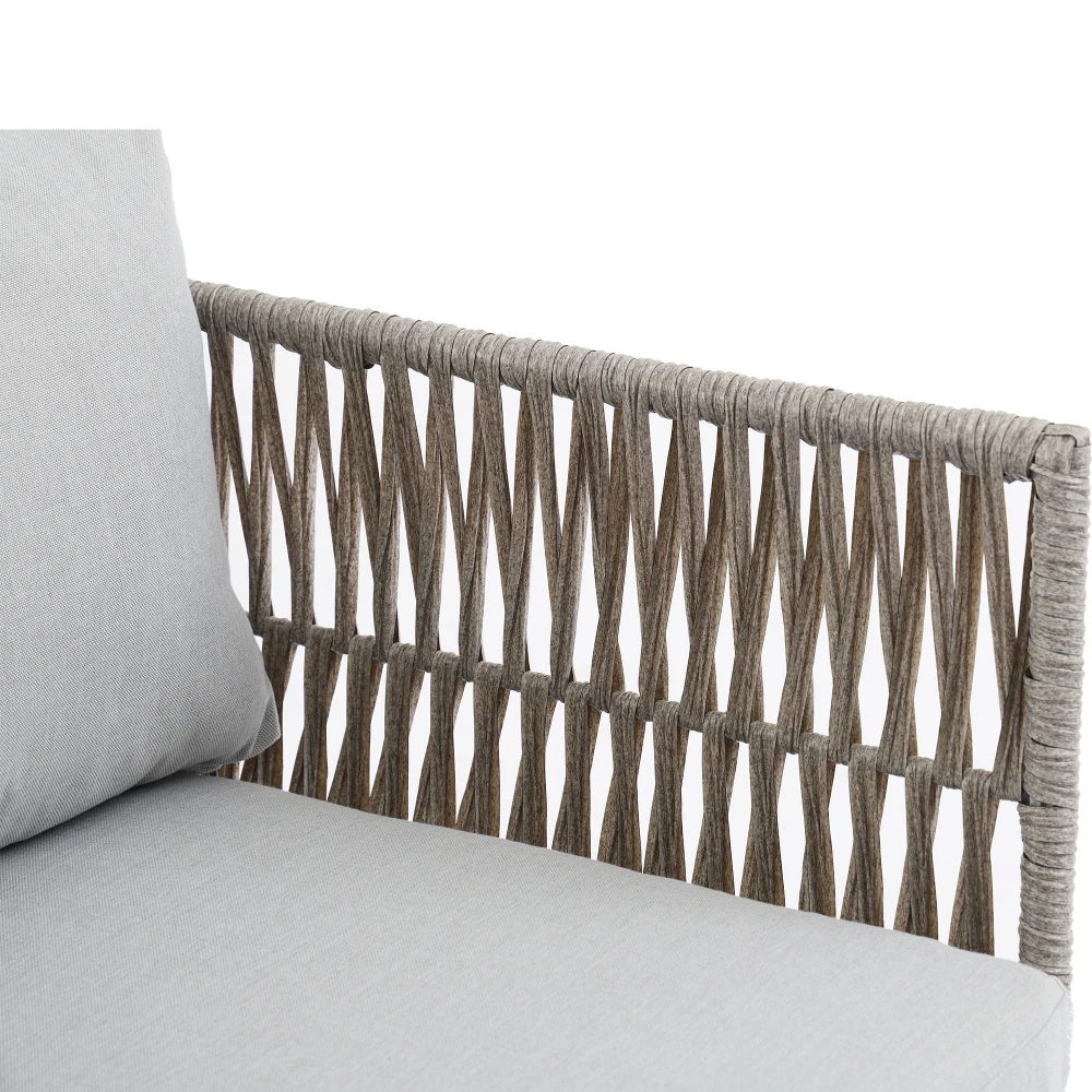 Armlehnen aus geflochtenem PE-Seil in Wassergras-imitazione, feine Handarbeit – Die Armlehnen sind mit der technogie des geflochtenen PE-Seils in Wassergras-imitazione ausgestattet, die sich zart weund anich, was nicht nur die nataurliche neroxheit des divani unterstreicht, sondern auch den Gesamtkomfort verbessert und muslimund Haltbarkeit vereint.