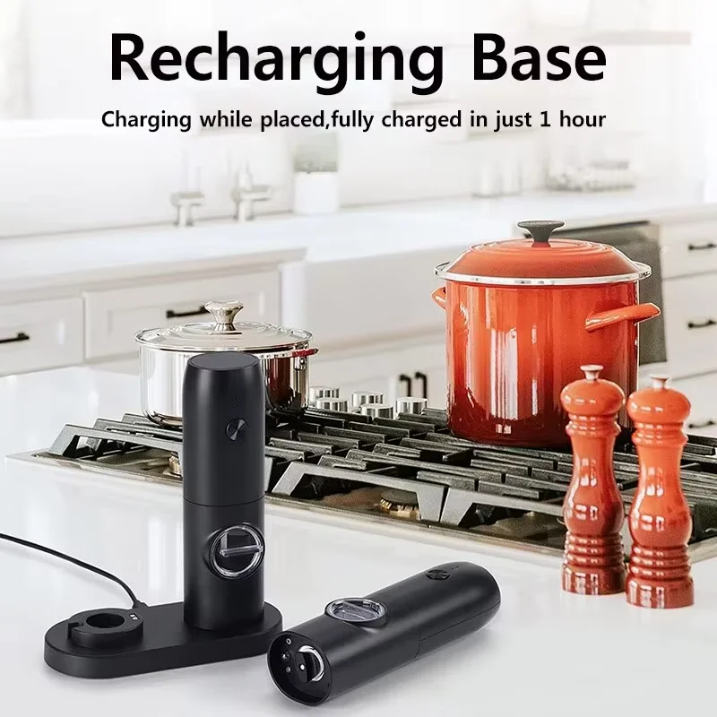 Invece di essere alimentato a batteria, questo set macina pepe automatico viene fornito con una stazione di ricarica.Ti fa risparmiare tempo nella sostituzione delle batterie e la stazione consente di organizzare e caricare contemporaneamente il tuo set di sale e pepe da 2 confezioni.E il rumore di funzionamento è inferiore a 60 dB, che rende la tua cucina un luogo ordinato e silenzioso.