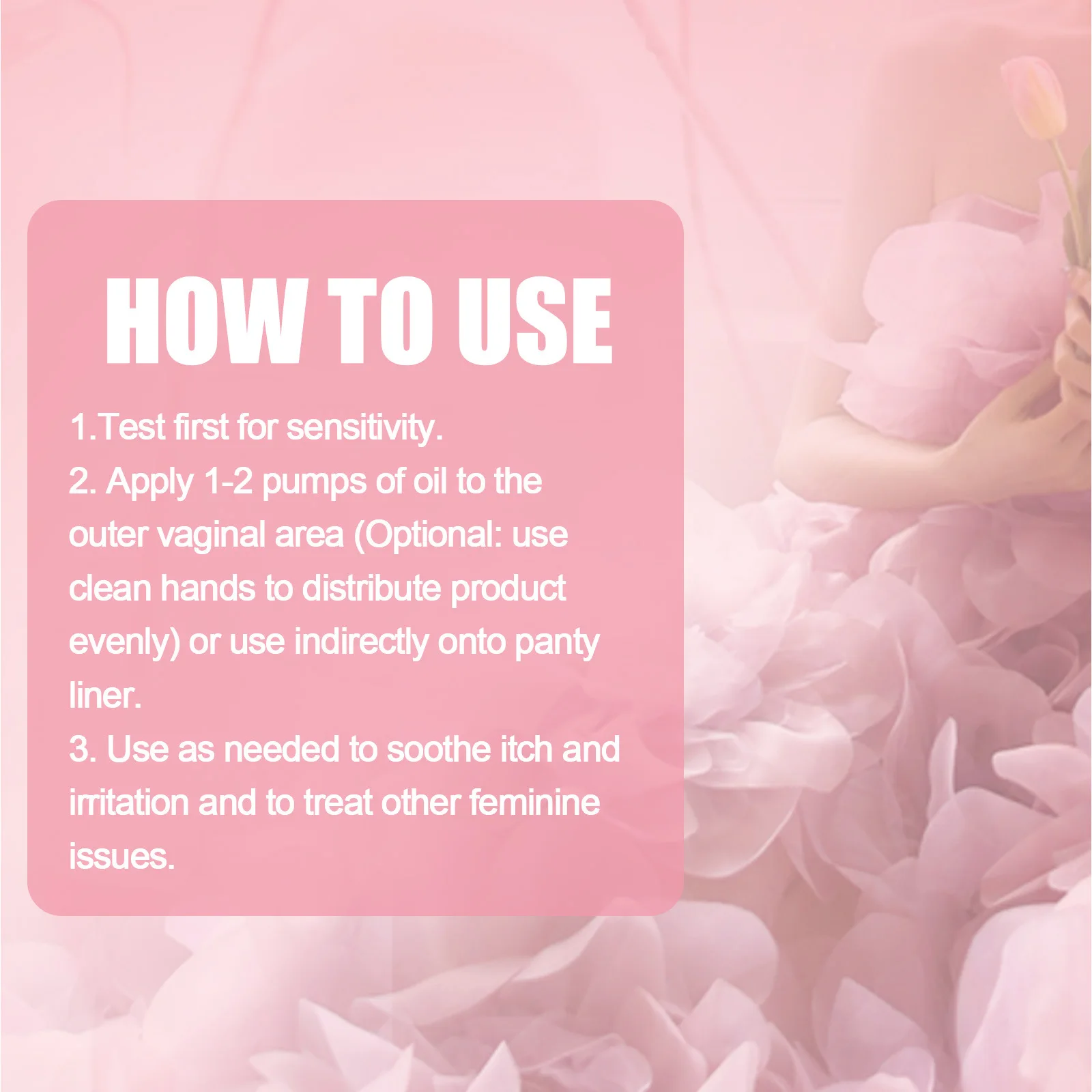 2.Apply 1-2 pumps of oil to the outer vaginal area (optional:Use clean hands to distribute product evenly)or use indirectly onto panty liner.