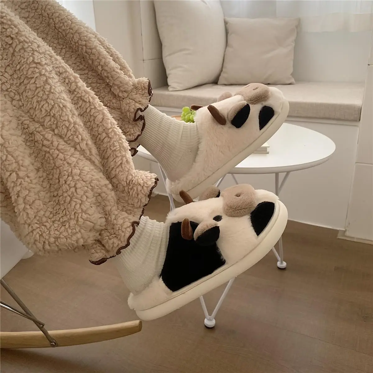 Shevalues Peluche Cartoon Mucca da latte Pantofole Invernali da donna Pantofole pelose antiscivolo Scivoli in cotone da donna Coppie Scarpe basse morbide e accoglienti