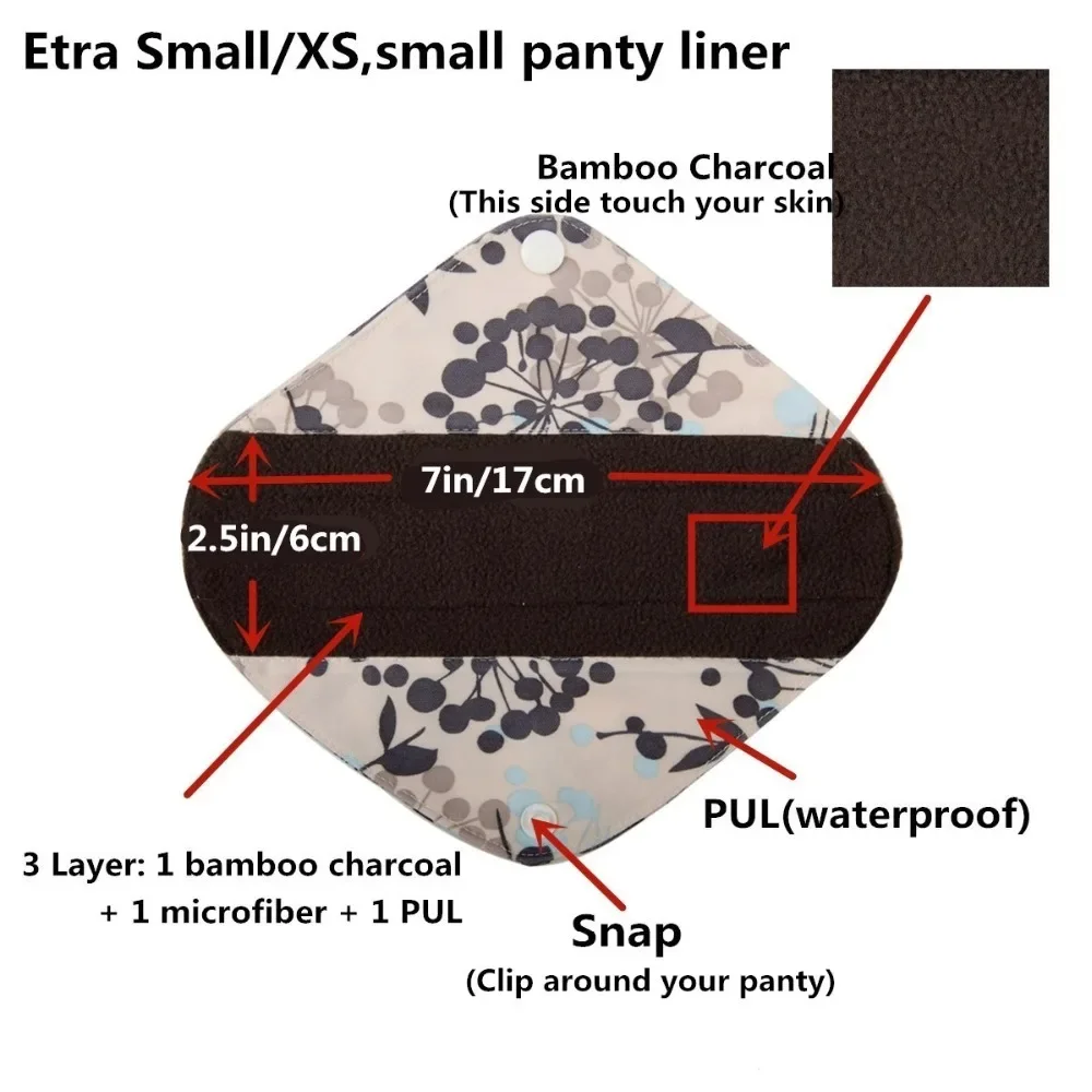 Composizione: compresso di 3 strati, strato superiore è l strato di carbone di bambù morbido e liscio contro la pelle, strato interno è di 1 strato di microfibra che è super assorbente e strato esterno è di 1 strato con un supporto PUL impermeabile per evitare perdite.