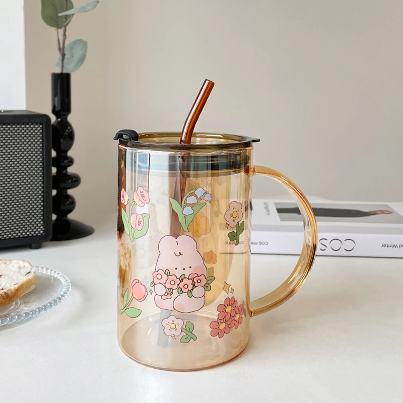 Simpatico coniglietto tazza di vetro con coperchio paglia Kawaii tazze da caffè grande birra al latte bicchieri da vino tazza di succo d’acqua coreana bicchieri regalo