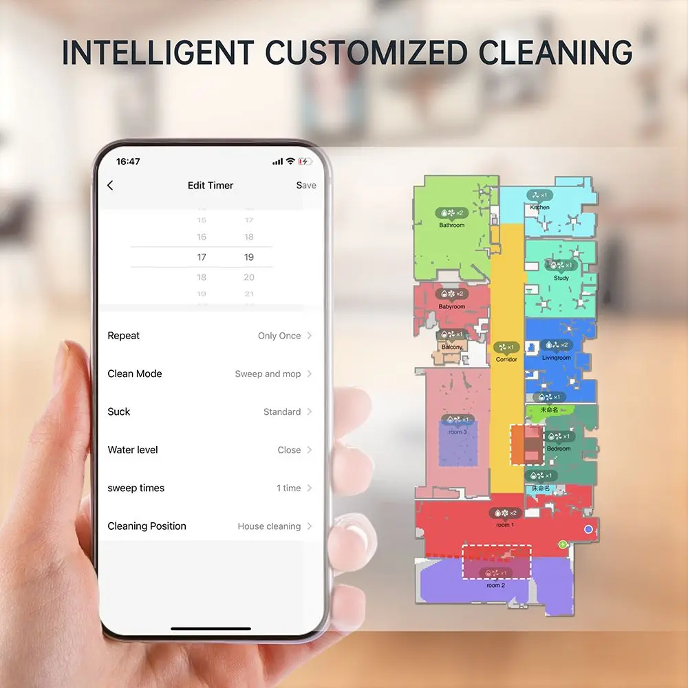 Con l’app, puoi controllare il robot individualmente per selezionare le modalità di pulizia, pulire le stanze specifiche, impostare le pareti virtuali, definire le aree per evitare, ecc. Puoi anche utilizzare l’app da qualsiasi luogo se è disponibile una rete, controllare e monitorare a distanza il robot. Tramite i comandi vocali, puoi utilizzare Google Assistant o Amazon Alexa per avviare, mettere in pausa o fermare il robot, rendendo la pulizia automatica ancora più conveniente. Il robot aspirapolvere e mop S8 Pro è dotato di un telecomando che offre diverse modalità di controllo per un funzionamento più semplice.