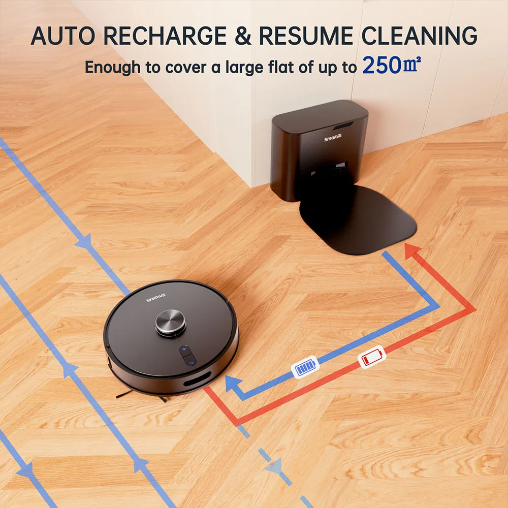 Sensori avanzati disegnano mappe rapidamente e con precisione, i cuscinetti di protezione dalle collisioni prevengono urti, pianificazione intelligente del percorso e prevenzione degli ostacoli e i sensori abyss prevengono le cadute; che non lascia posti nascosti per la polvere.