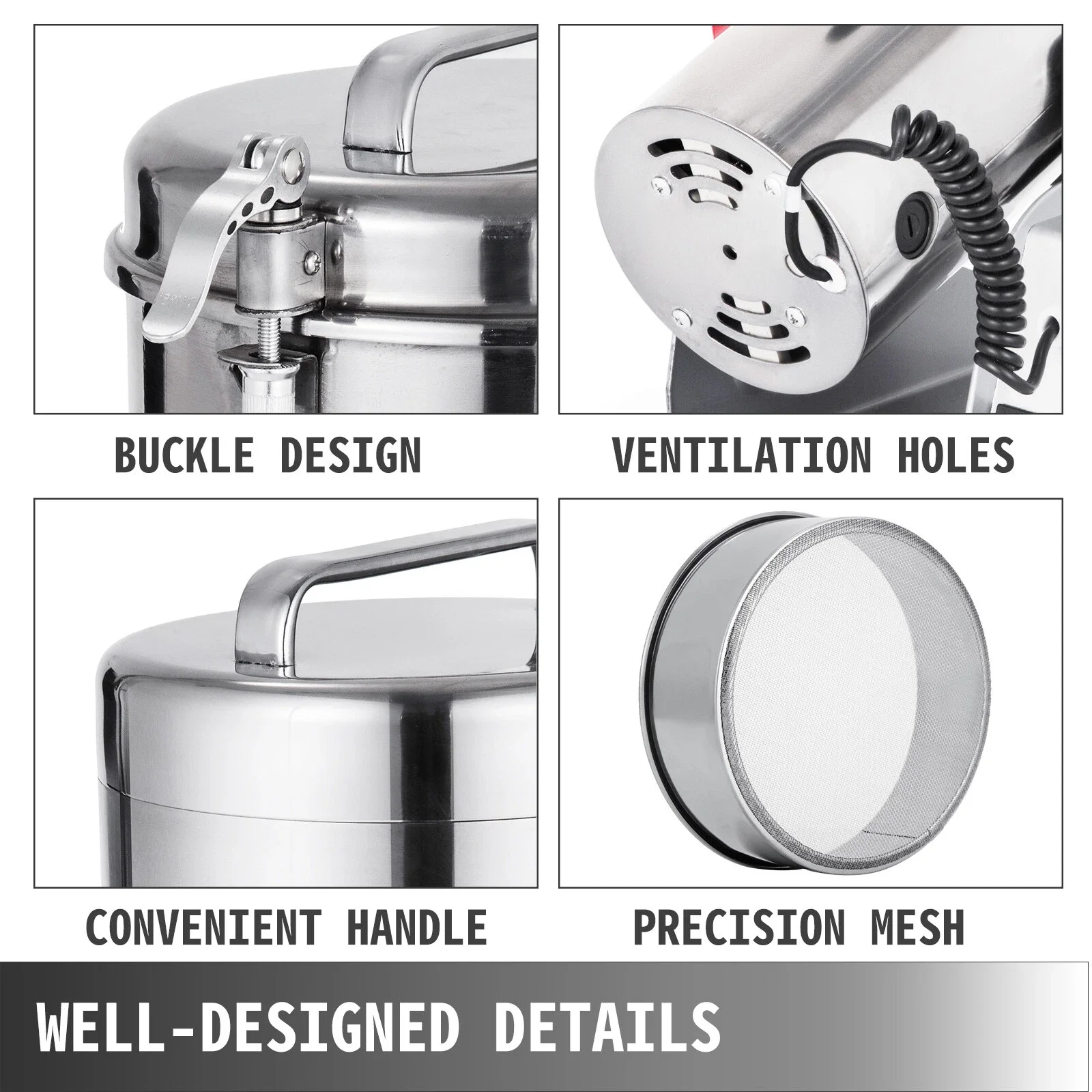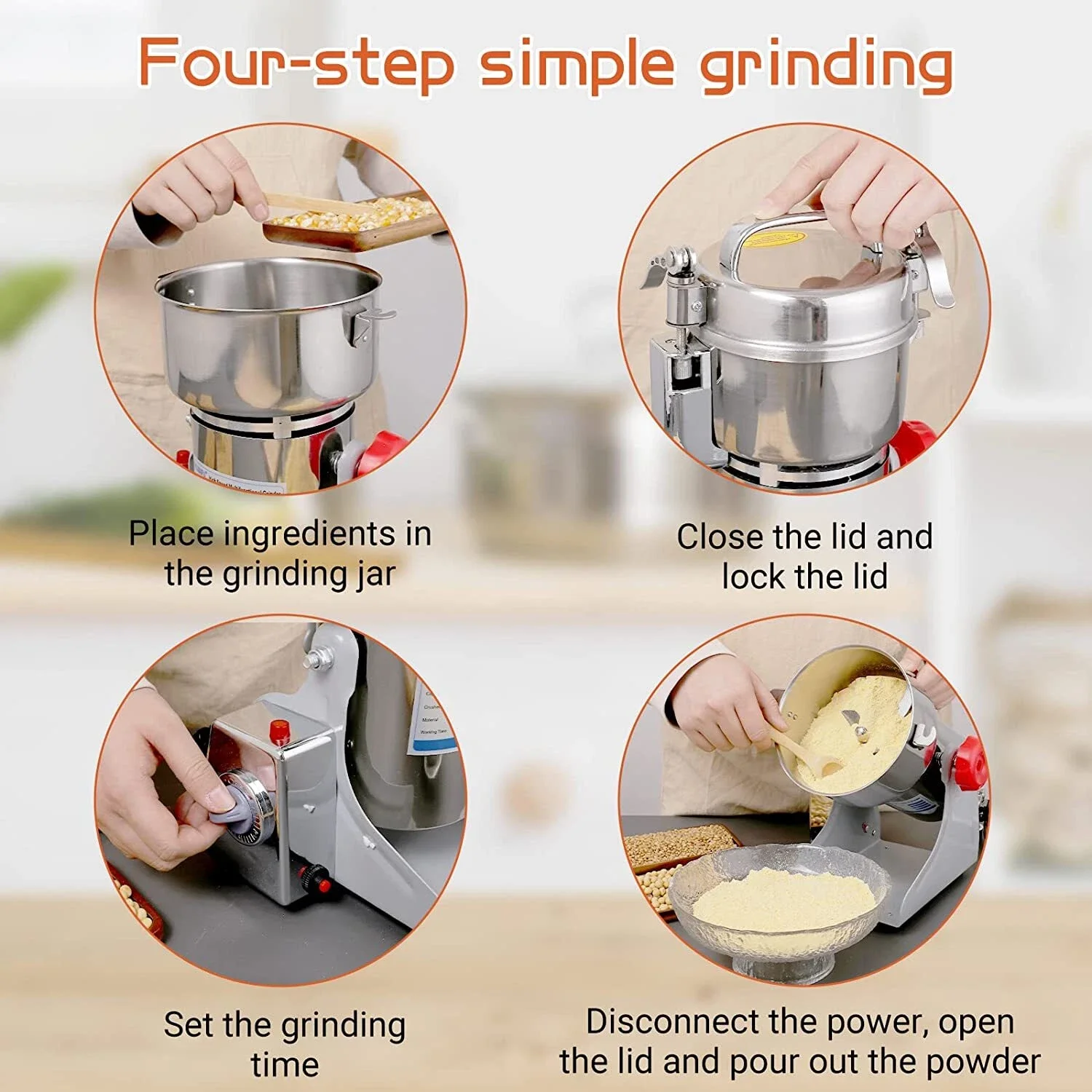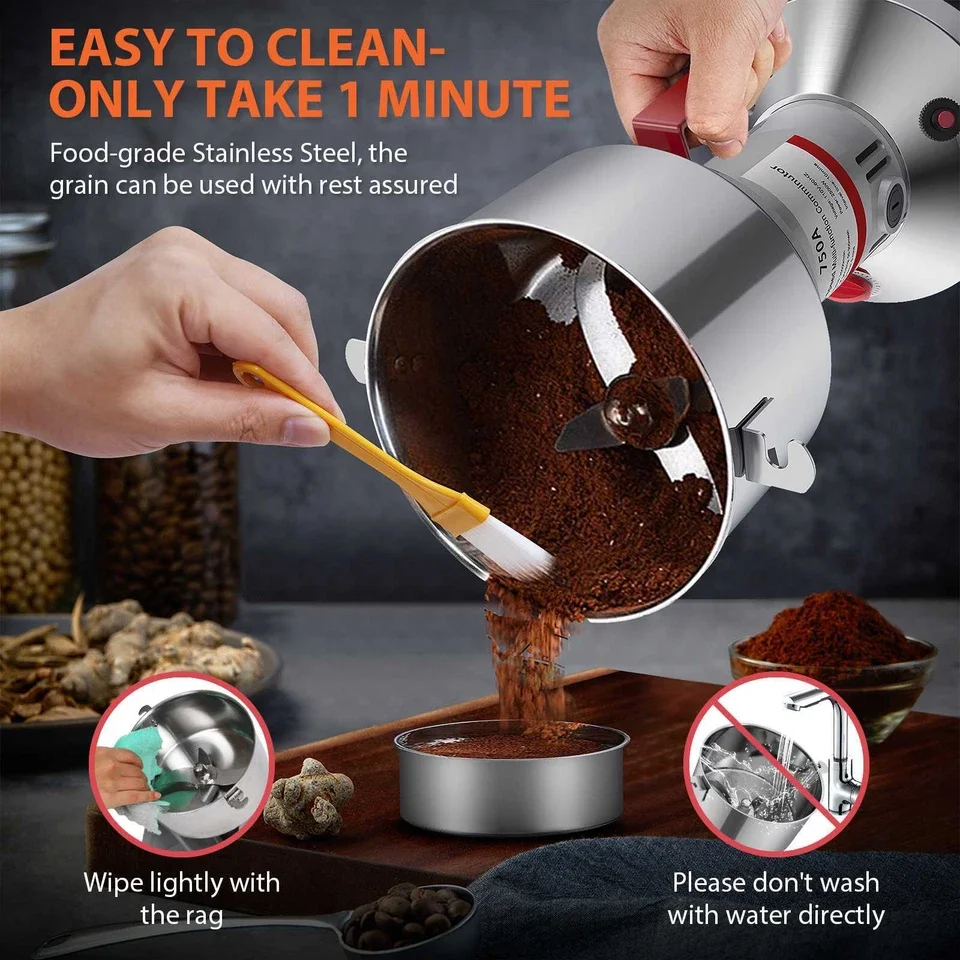 ✅Adatto a tutti i materiali secchi: il mulino multifunzionale può macinare tutti i materiali secchi come cereali, spezie, rimedi cinesi, chicchi di caffè, noce moscata, vaniglia, foglie di alloro, mangime per uccelli, cibo per cani, pepe, peperoncino, ecc.UN AVVISO!Non sono adatte noci e mandorle ad alto contenuto di olio e materiali umidi!La quantità di materiale dovrebbe essere compresa tra la lama lunga coprente e 2/3 della capacità della scatola di levigatura.