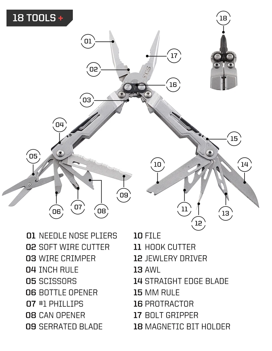 Include lama seghettata, apriscatole, regola in pollici, pinza a becco d’ago, pinza per bulloni, tagliafili morbidi, lama a bordo dritto, punteruolo, avvitatore per gioielli, taglierina a gancio, lima, regola mm, porta punte magnetiche, pinza per filo, forbici, apribottiglie,#1 Phillips.