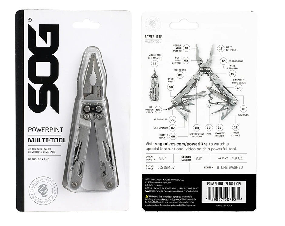 Il PowerPint è un mini multiutensile con l’utilità di dimensioni standard.Il Pint è dotato di 18 attrezzi e un portapunte esagonale magnetico.E del corso presenta la leva del composto di SOG che fornisce un’apertura e una maggiore potenza di presa.Solo 5″ di lunghezza e una leggera 4,2 once, PowerPint è un multiutensile completo che è grande nella tasca, nella tua confezione, sulla panca degli attrezzi, oppure intorno alla casa.Disponibile anche con rivestimento nero.