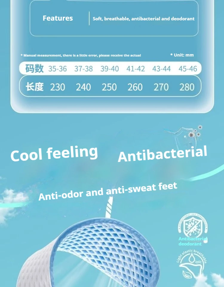 Aggiungi appositamente con un materiale fresco, porta un tocco rinfrescante sul contatto, allevia efficacemente il calore e l’affaticamento dei piedi causati dall’attività prolungata, digialo una scelta ideale per gli sport estivi.